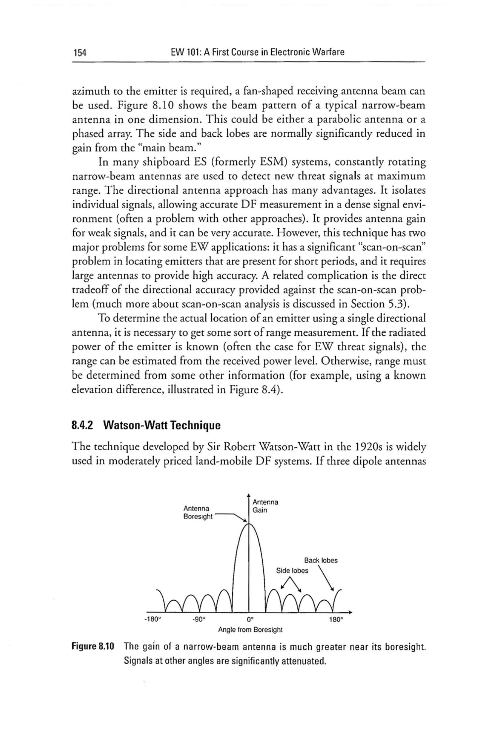 在许多舰载ES(原ESM)系统中,采用不断旋转的窄波束天线来在最大距离上探测新的威胁信号。方向天线法有许多优点。它能分离单个信号,从而在信号密集环境中进行精确测向(其他方法常常存在问题);它能为弱信号提供天线增益;并且它的精度可以很高。然而,该方法在某些EW应用中存在两个主要问题:在处理短时存在的辐射源时存在显著的“扫描对扫描”问题;并且为了实现高精度需要大型天线。相关的复杂性在于方向精度和扫描对扫描问题之间存在直接的权衡关系(有关扫描对扫描分析的更多内容见5.3节)。