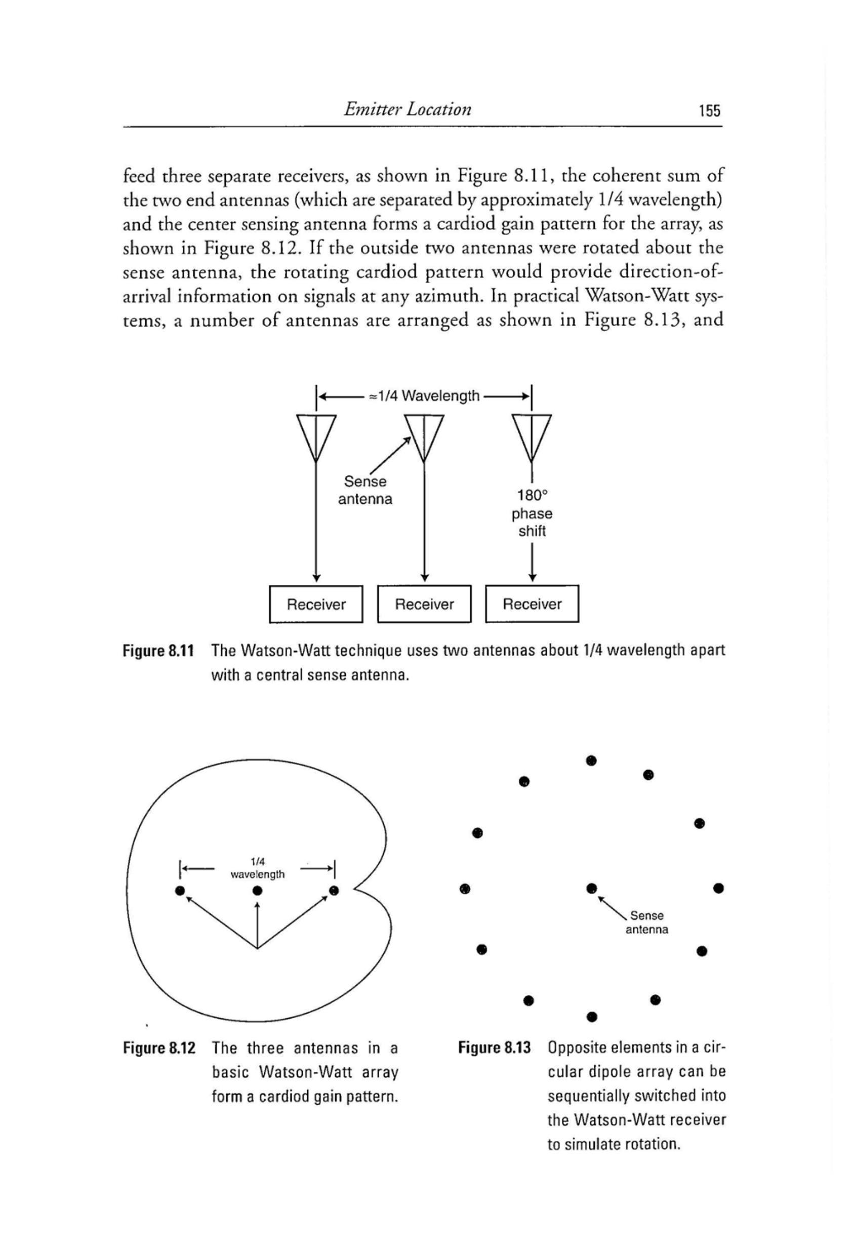Robert Watson-Watt爵士在20世纪20年代开发的技术被广泛应用于价格适中的陆基机动DF系统。如图8.11所示,三个偶极子天线馈入三个独立接收机,两个端部天线(相距约\(1/4\)波长)的相干和与中央感应天线形成一个心形增益方向图,如图8.12所示。如果将两端天线绕感应天线旋转,旋转的心形方向图即可提供任意方位角信号的入射方向信息。在实际Watson-Watt系统中,天线布置如图8.13所示,外围天线的对置对依次切换到两个接收机中,以模拟旋转。天线数量越多,DF精度越高。但通过合理校准,即使只有四根天线也能提供可接受的结果。