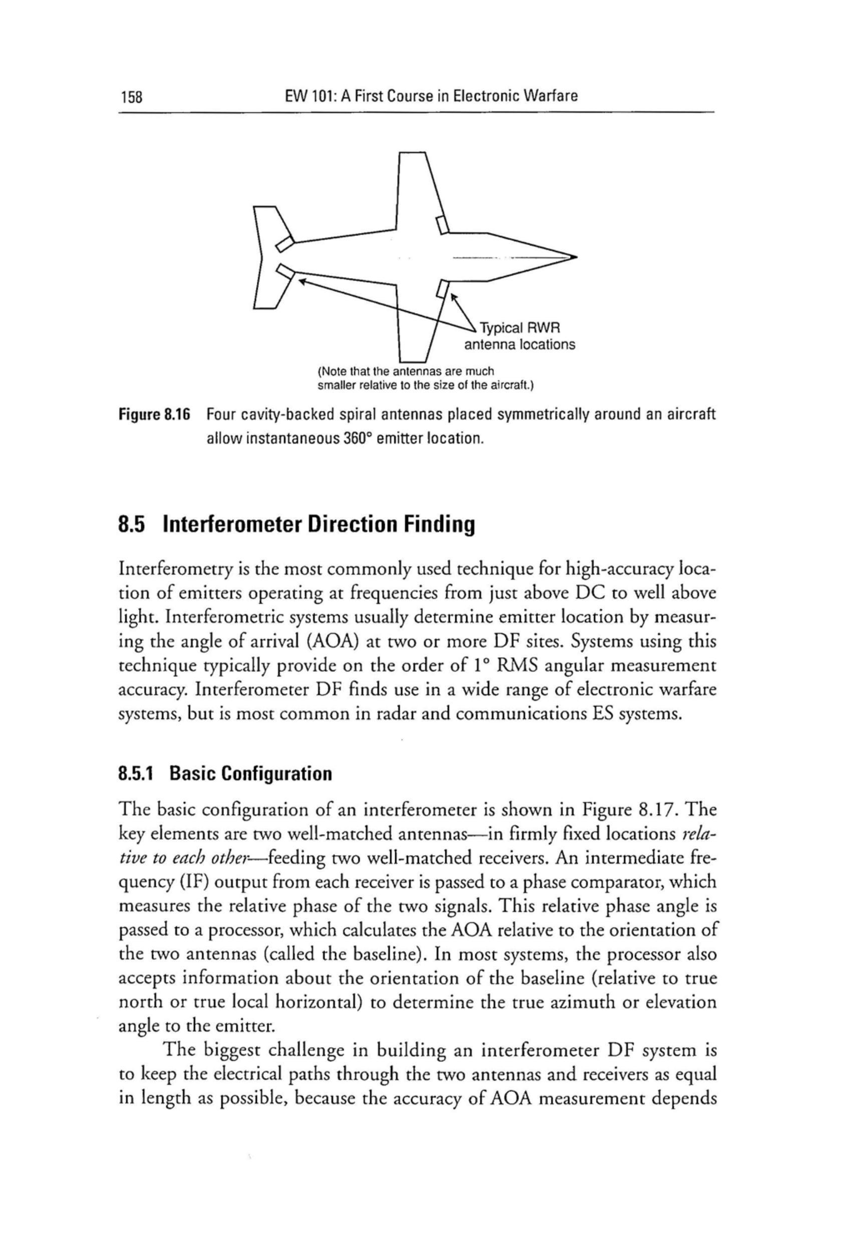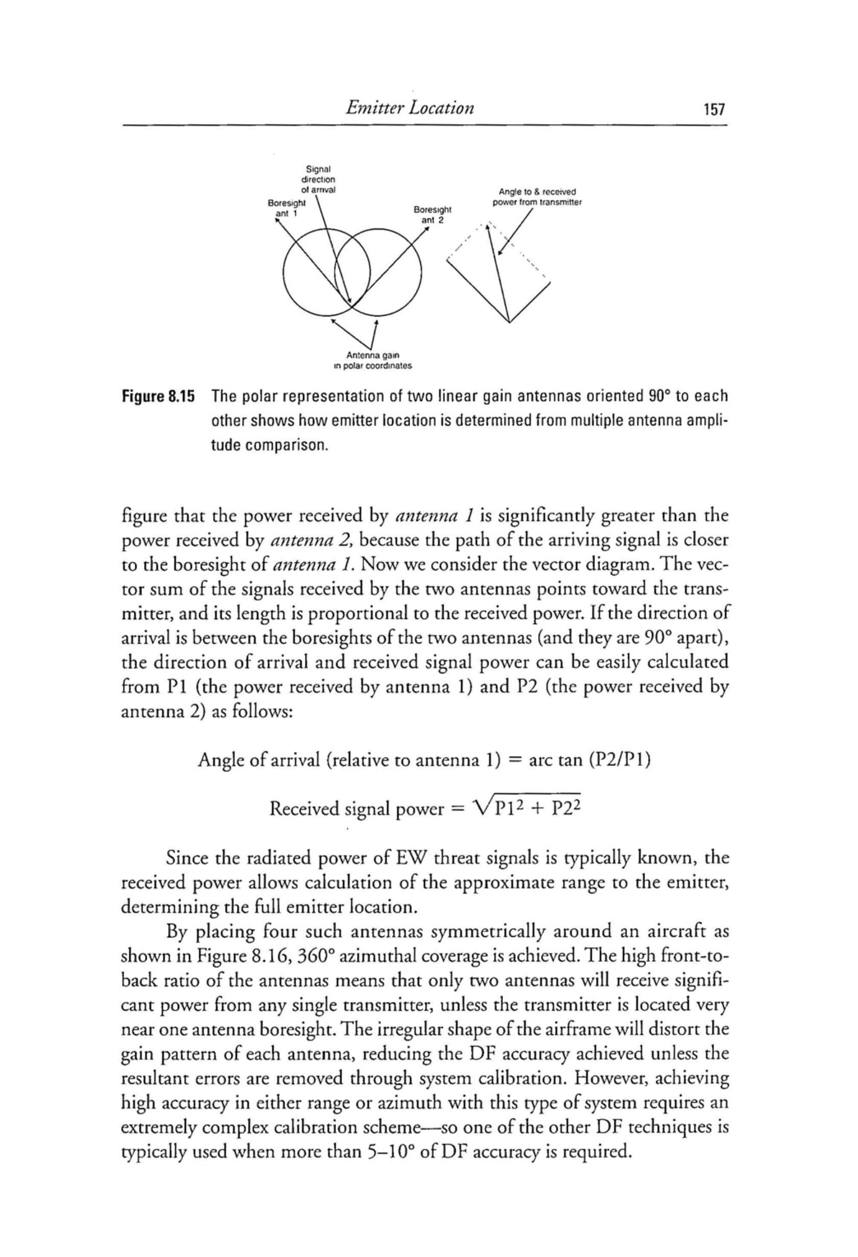 通过如图8.16所示将四根此类天线对称安装在飞机周围,可以实现\(360^{\circ}\)方位覆盖。由于天线的高前后比,对于任何一个发射机,最多只有两根天线会接收到显著功率,除非发射机几乎正对某根天线的主轴。机体的不规则形状会扭曲每根天线的增益模式,从而降低DF精度,除非通过系统校准消除这些误差。然而,要在此类系统中获得高精度的距离或方位测量,需要极其复杂的校准方案——因此,当需要超过\(5\sim10^{\circ}\)的DF精度时,通常采用其他DF技术。