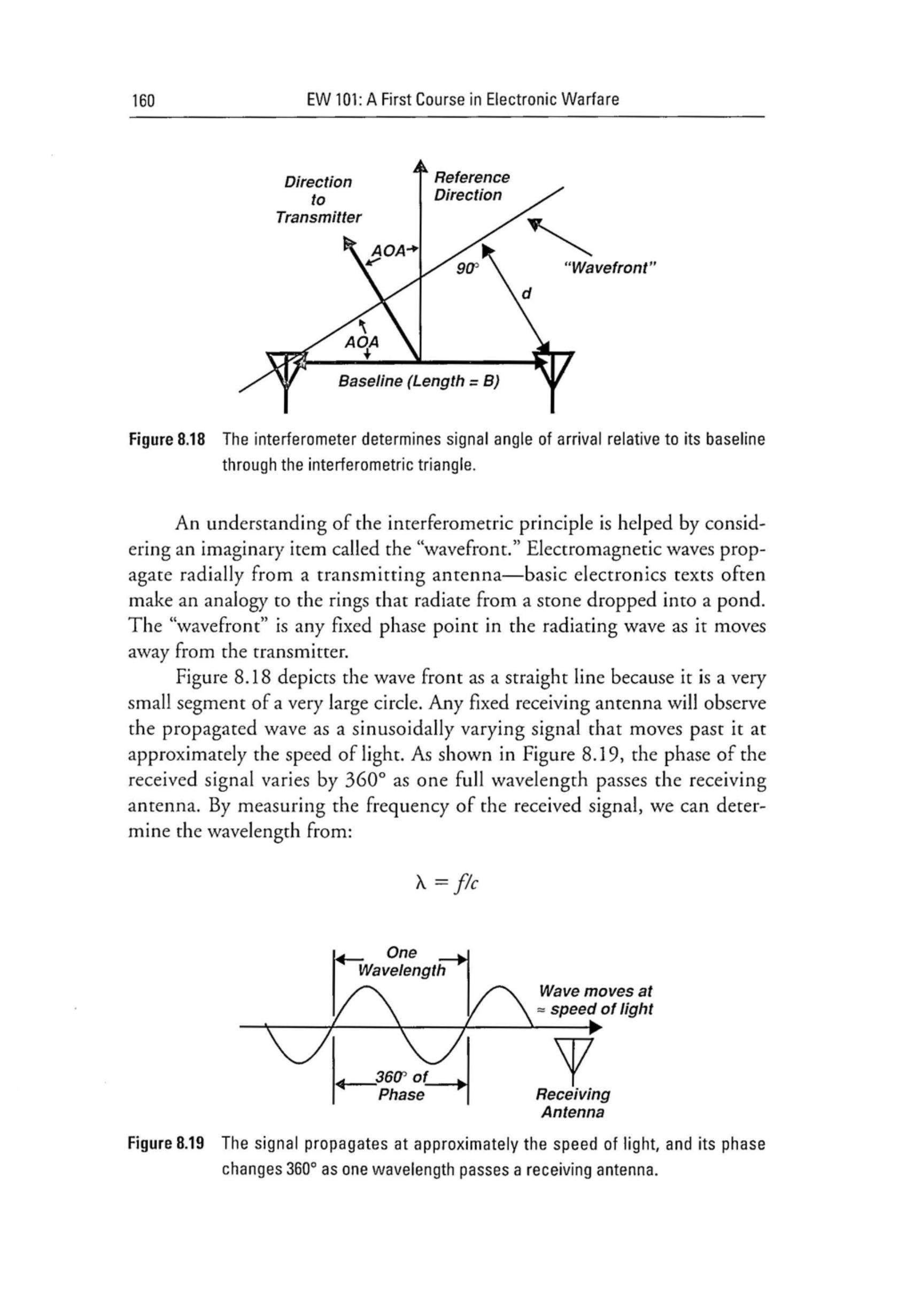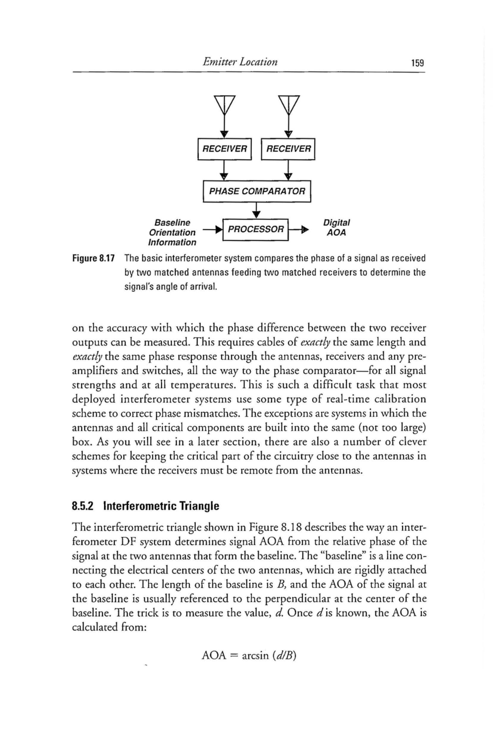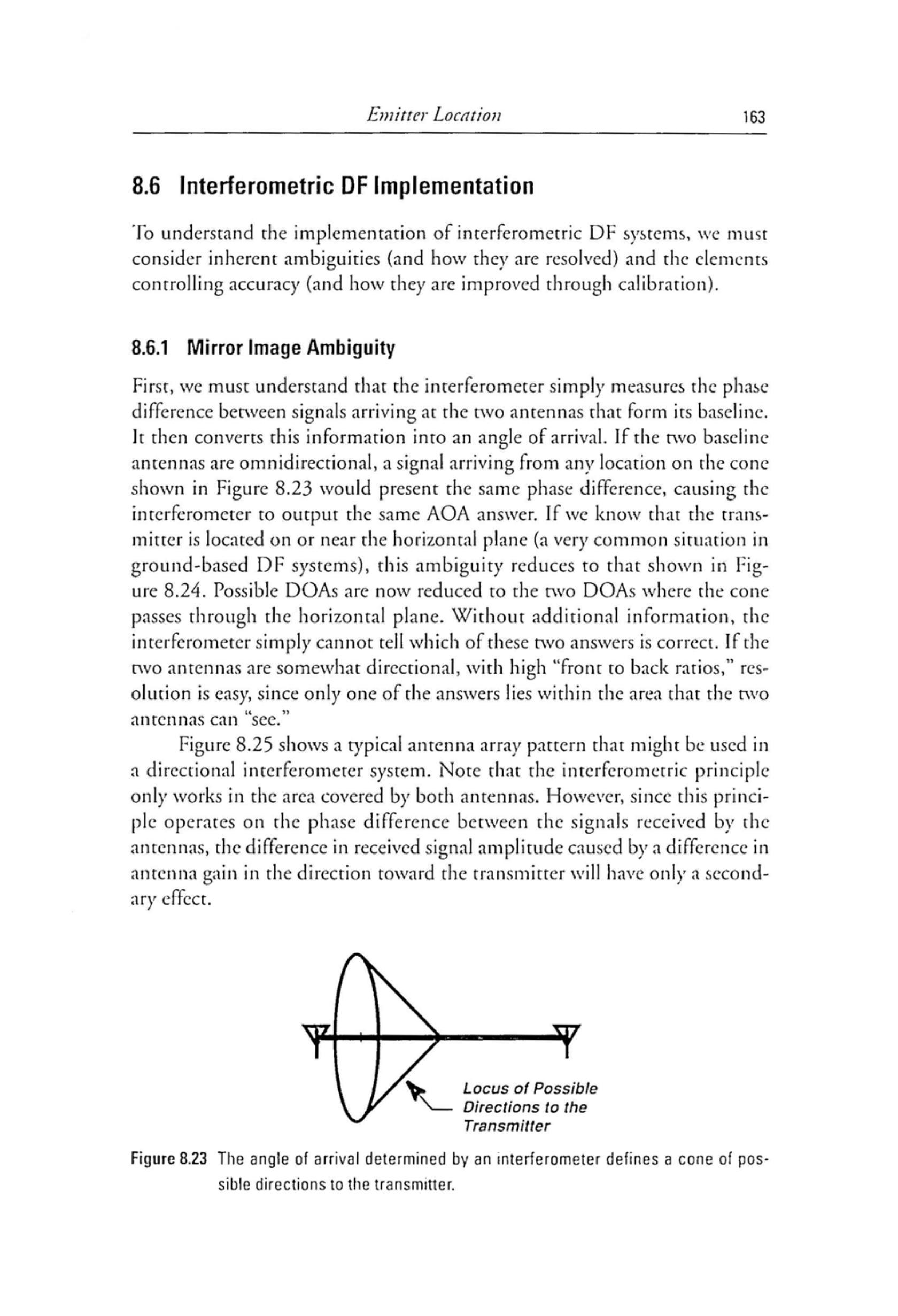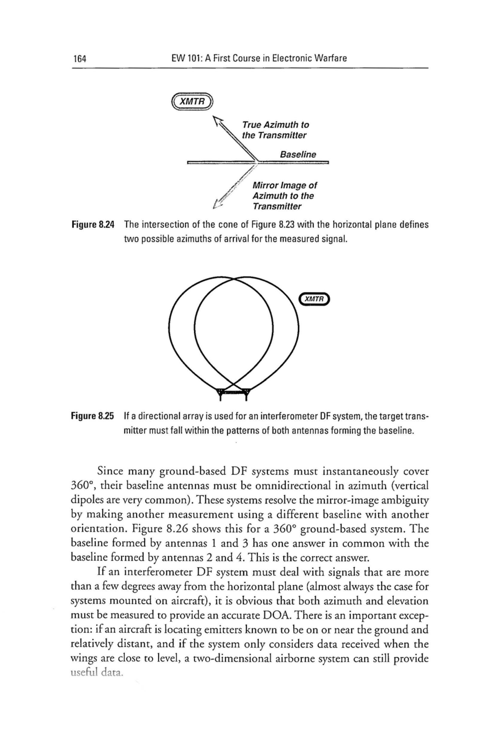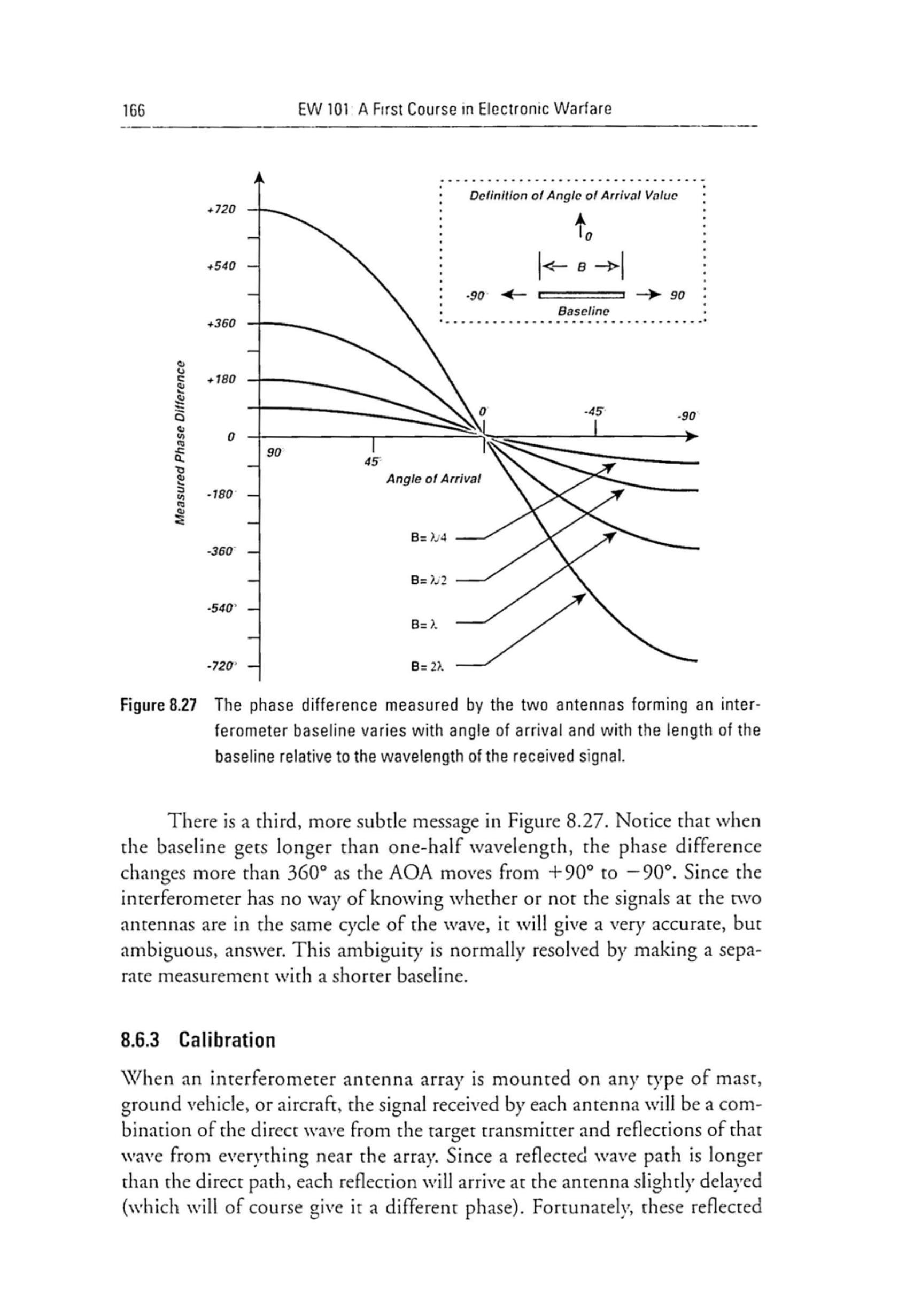 图8.27还有一个更微妙的含义。注意当基线长于半波长时,AOA从\(+90^{\circ}\)到\(-90^{\circ}\)时相位差变化超过\(360^{\circ}\)。由于干涉仪无法判断两天线接收信号是否处于同一波周期,它会给出非常精确但存在歧义的答案。通常通过使用一条更短的基线进行另一次测量来解决该歧义。