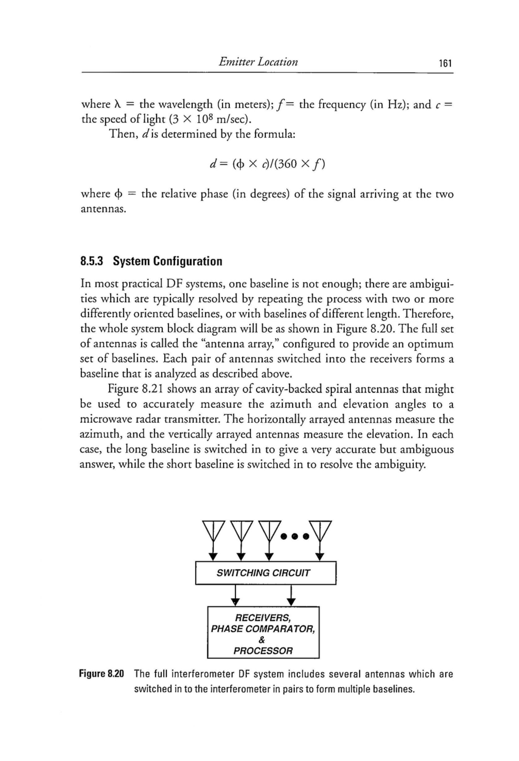 在大多数实际DF系统中,单一基线是不够的;存在歧义,通常需要通过两个或更多方向不同的基线,或不同长度的基线重复测量来解决。因此,完整的系统框图如图8.20所示。完整的天线集称为“天线阵列”,其配置可提供一组最优基线。每次切换到接收机的天线对形成一条基线,按上述方法进行分析。