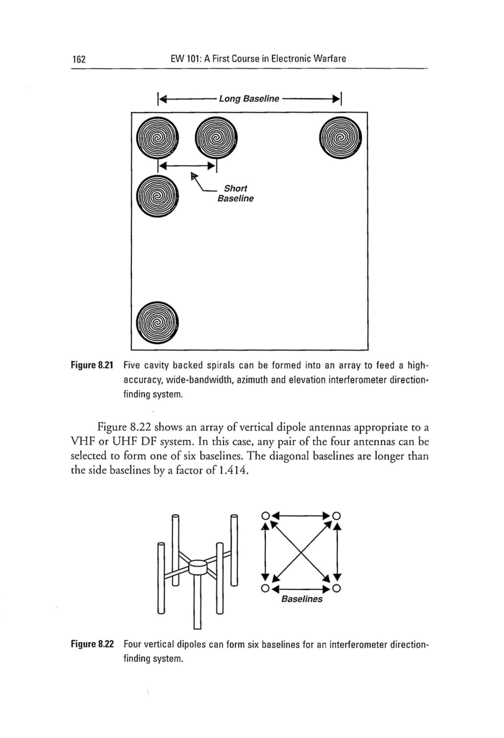 图8.21展示了一组背腔螺旋天线阵列,可用于精确测量微波雷达发射机的方位角和俯仰角。水平阵列天线用于测量方位角,垂直阵列天线用于测量俯仰角。在每种情况下,长基线提供高精度但存在歧义,而短基线用于消除歧义。