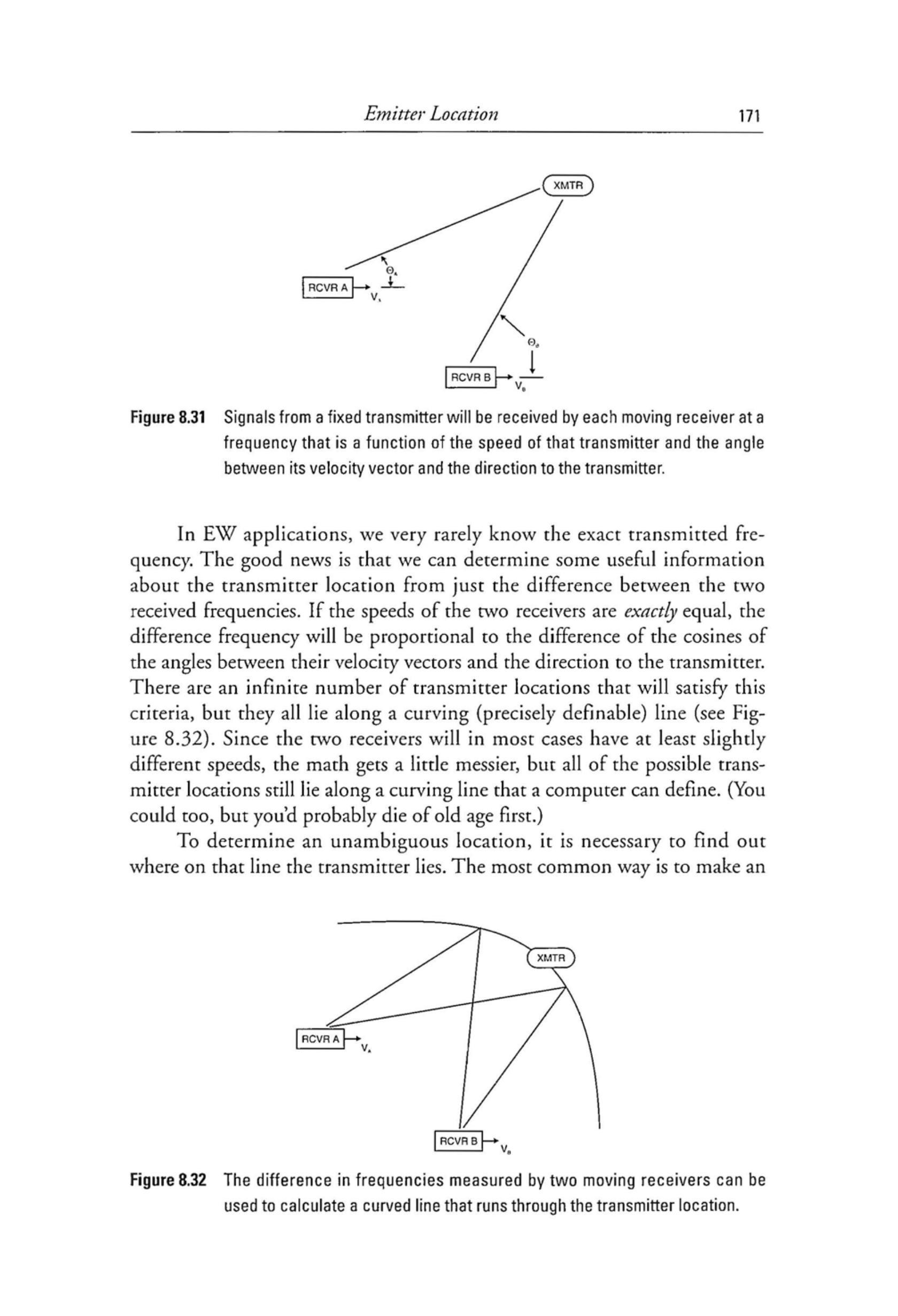 在EW应用中,我们极少知道确切的发射频率。好消息是,即便如此,仅通过比较两个接收机接收频率的差值,也能推断出发射机位置的一些有用信息。如果两接收机速度完全相同,差频将与它们速度矢量与发射机方向夹角的余弦差成正比。满足该条件的发射机位置有无数个,但它们都位于一条弯曲(数学上可定义)的线上(见图8.32)。由于两接收机速度通常会有至少轻微差异,数学处理会稍微复杂一些,但所有可能的发射机位置仍然位于一条可由计算机定义的曲线上。(你也可以算,但可能会老死在算式前。)