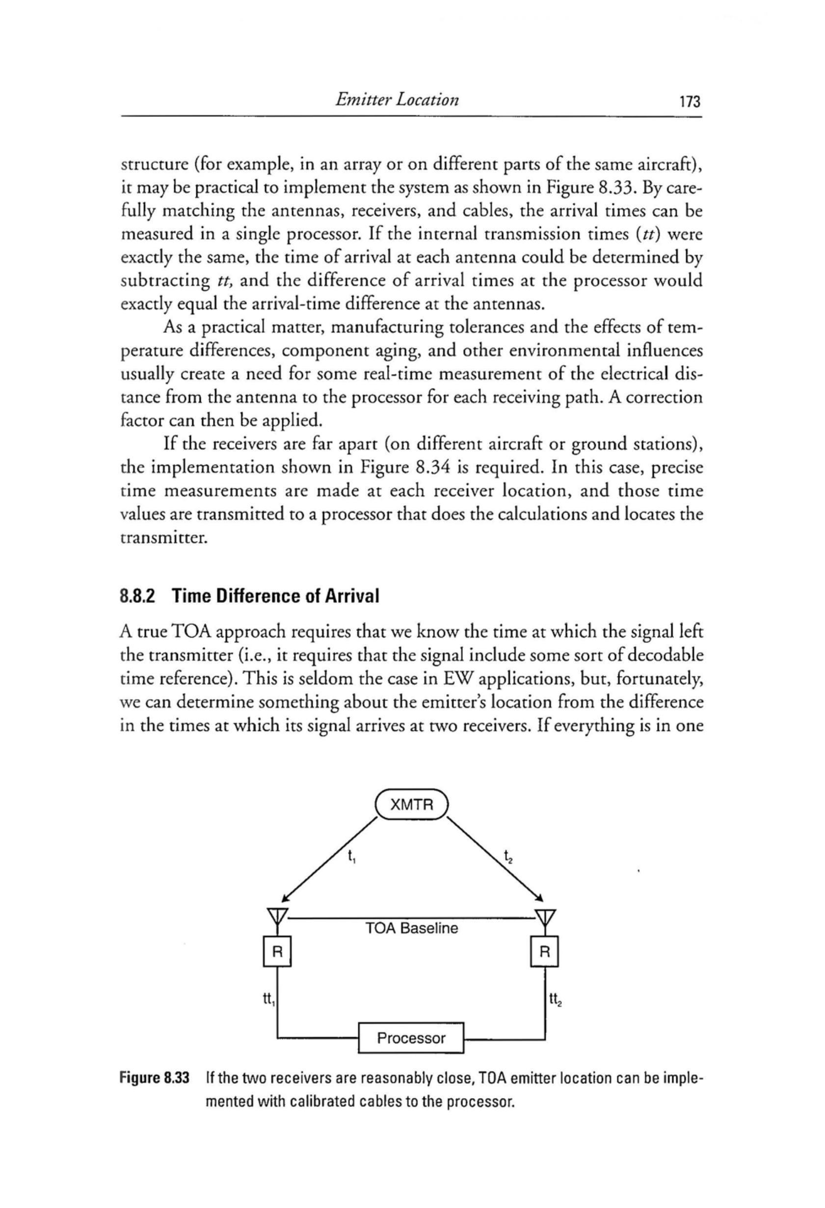 TOA辐射源定位系统的实现方式主要取决于接收机之间的间距。如果两接收机在同一物理结构上(如同一阵列或同一飞机的不同部位),可实现如图8.33所示的系统。通过仔细匹配天线、接收机和电缆,可在单一处理器中测量到达时间。如果内部传输时间\((tt)\)完全相同,则每副天线的到达时间可通过减去\(tt\)确定,处理器中的到达时间差将完全等于天线处的到达时间差。