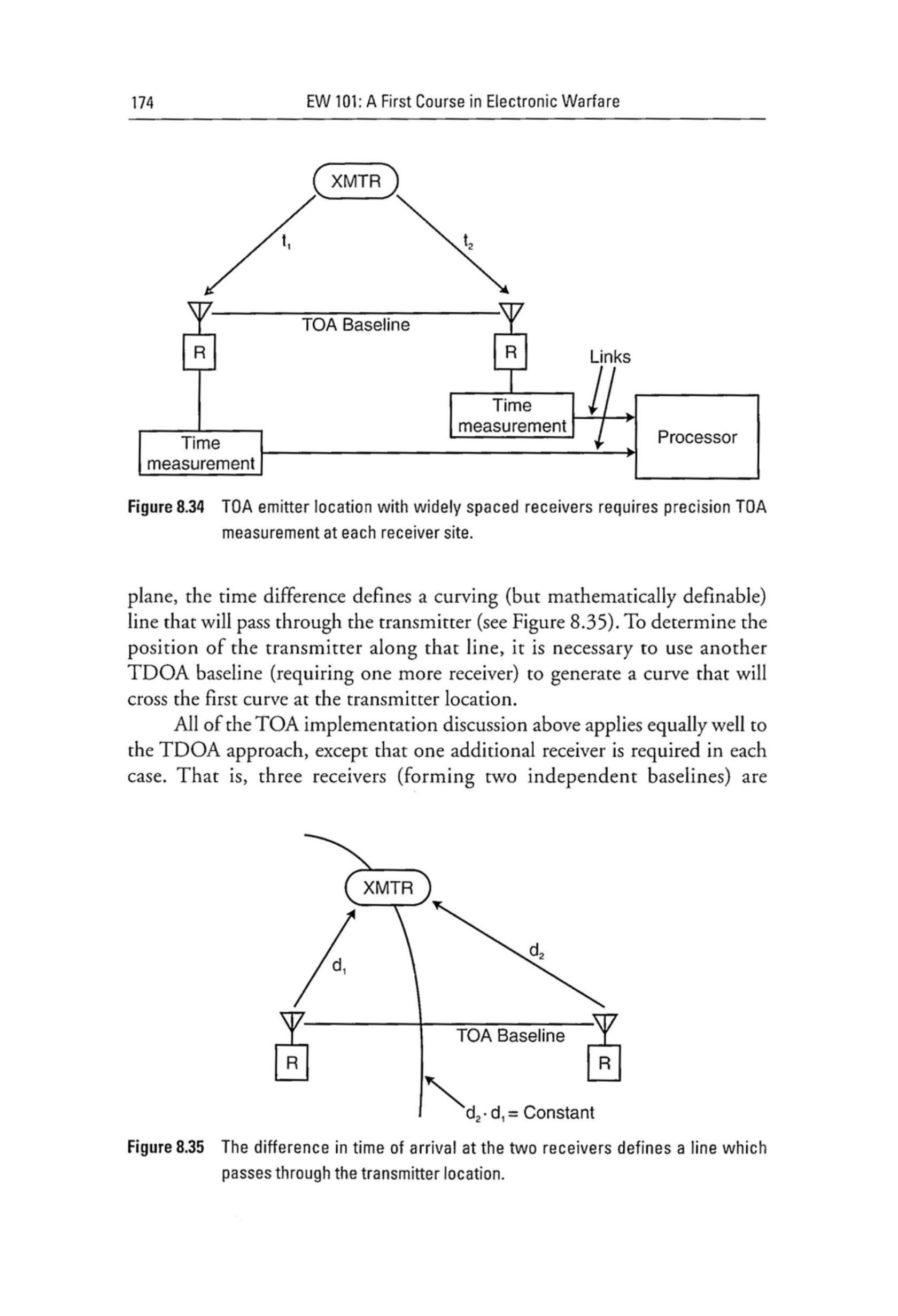 图 8.34 当接收机相距较远时,TOA辐射源定位要求在每个接收点进行精确TOA测量。