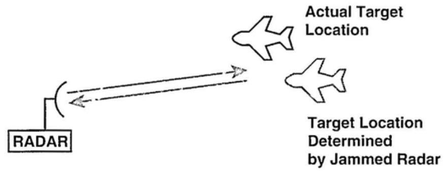 图 9.4 欺骗干扰干扰雷达处理,生成关于目标位置或速度的虚假信息。