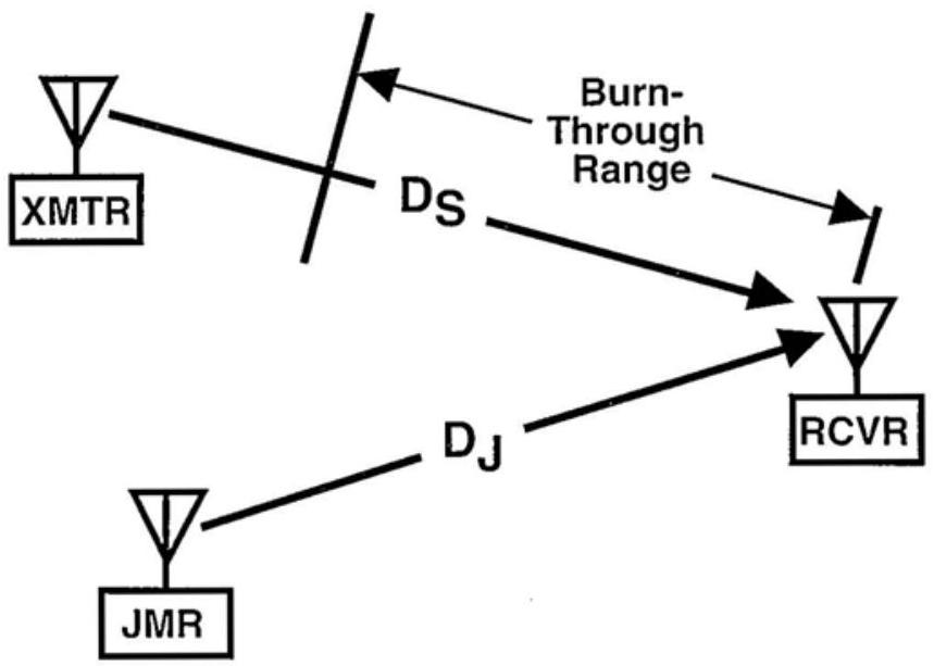 突破距离是干扰中的一个非常重要的概念,因为它涉及干扰在作战环境中保持有效的条件。当\(\mathrm{J}/\mathrm{S}\)比值降低到被干扰的接收机能够充分执行其任务时,就发生了突破。