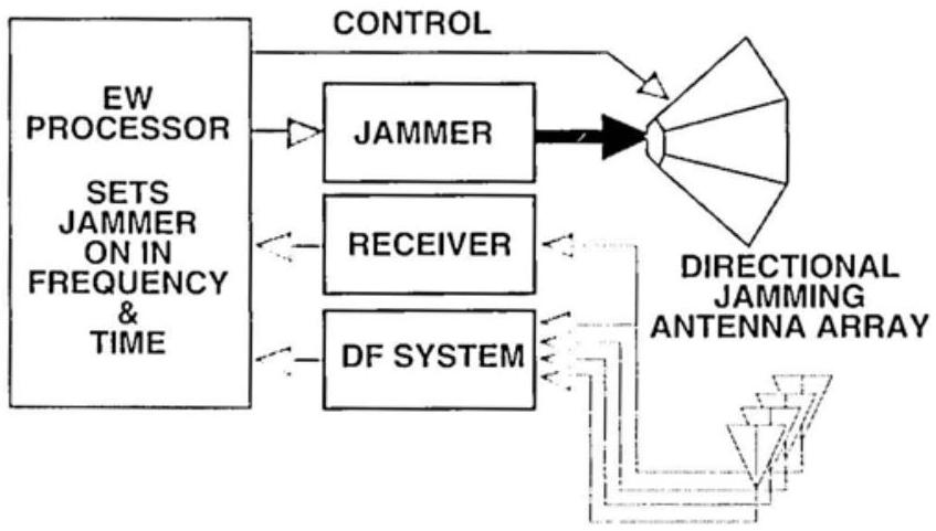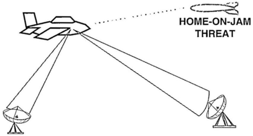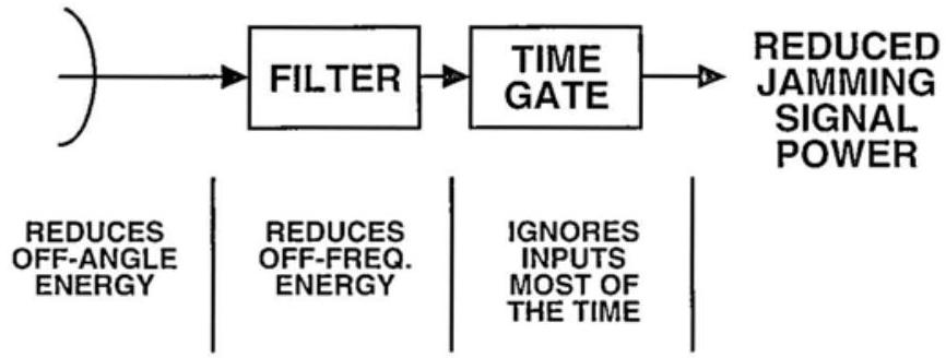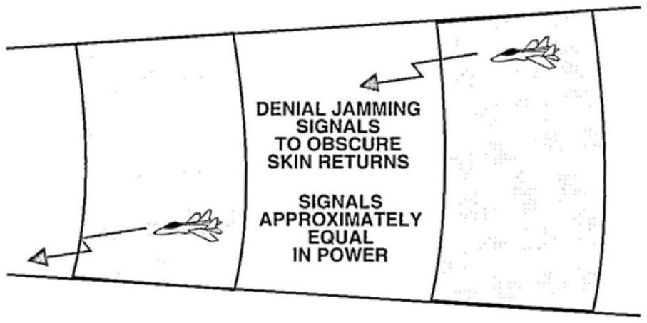 遗憾的是,该技术要求对雷达设计有较深入的了解,而不仅仅是其发射频率(即皮肤回波频率,不含多普勒移频)。必须知道雷达使用的是高侧还是低侧变频。如果雷达接收机的前端滤波很弱甚至没有调谐,则该技术只需中等\(\mathrm{J}/\mathrm{S}\)比即可奏效;但若滤波器选择性强,则可能需要60 dB甚至更高的\(\mathrm{J}/\mathrm{S}\)。