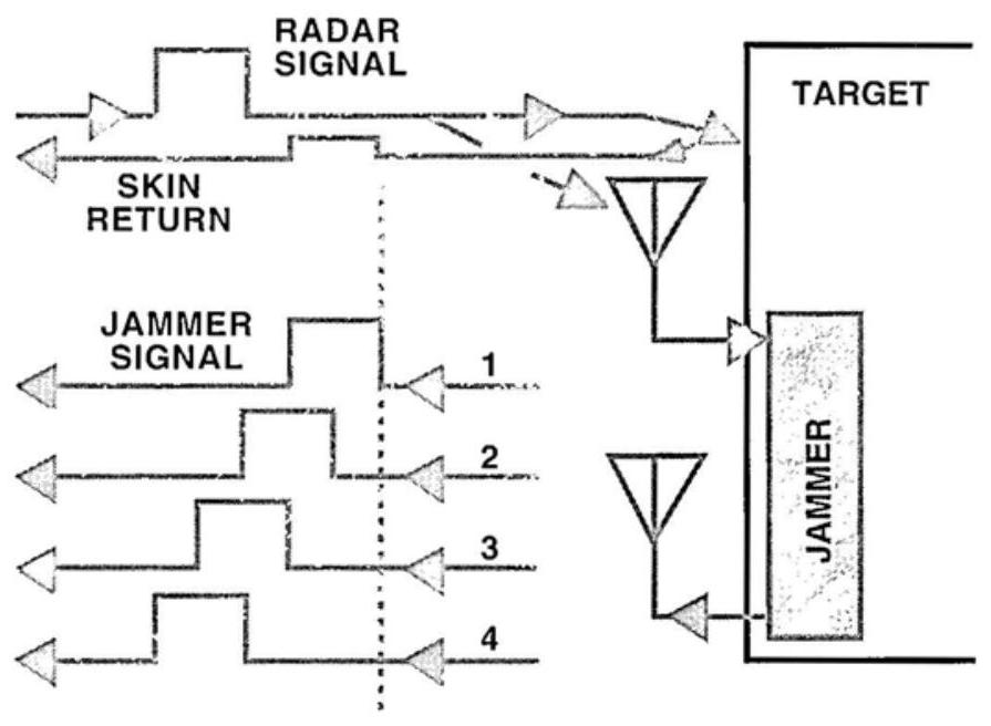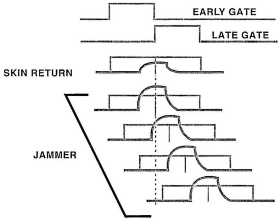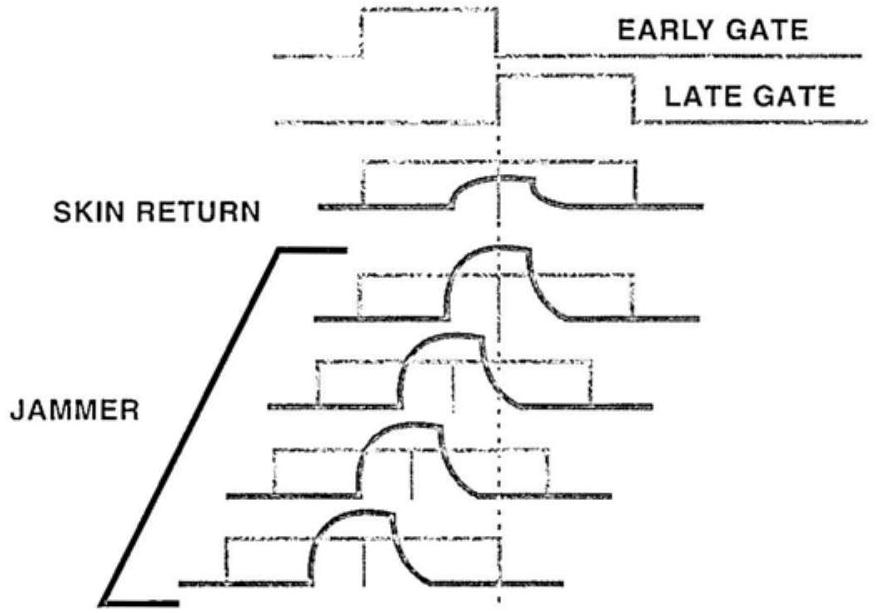 图 9.22 通过预判雷达脉冲,距离门拉入干扰机能够对抗前沿跟踪,但如果雷达没有单一稳定的脉冲重复频率,则会非常困难。