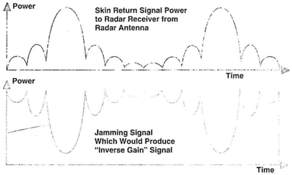 反增益干扰是一种用于使雷达丧失角度跟踪的技术。如果成功,该技术将要么剥夺雷达处理器的角度跟踪数据,要么在皮肤回波信号和干扰信号的共同作用下,使其做出错误的跟踪修正指令。该技术需要10–25 dB的\(\mathrm{J}/\mathrm{S}\)比。