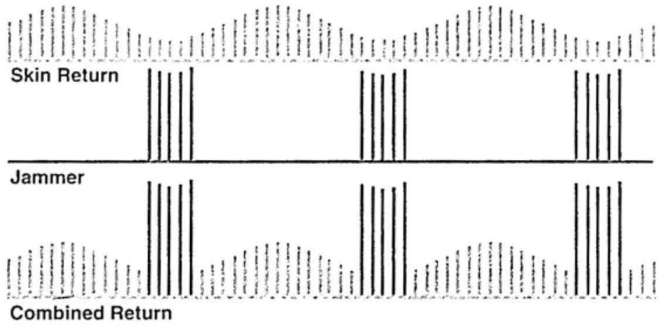 AGC干扰机以大约等于雷达天线扫描速率的频率发射极强脉冲。如图9.31所示,这些脉冲捕获了雷达的AGC。由此导致的增益降低使所有带内信号大幅度衰减。皮肤回波信号被抑制到极低水平,以至于雷达无法有效跟踪目标。