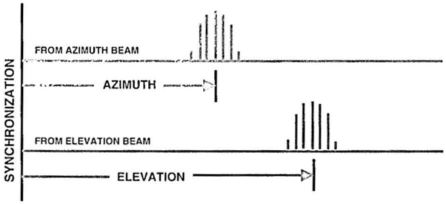 如图9.27所示,雷达可以通过记录最大皮肤回波出现时方位(或垂直)波束的位置来确定目标的方位角;最大皮肤回波出现时俯仰(或水平)波束的位置决定了目标的俯仰角。如果两束波束恰好同时扫过目标(如图9.26所示),两次响应将是时间同步的。
