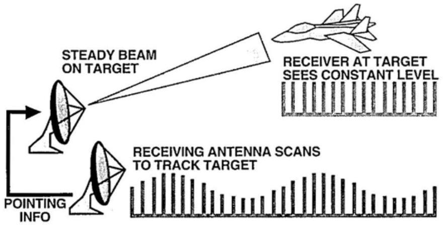 图 9.29 SORO雷达对目标施加稳定照射信号,并用扫描接收天线跟踪目标。