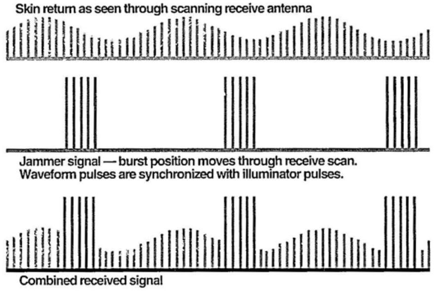 图 9.30 将周期性移动的同步脉冲突发注入SORO雷达的跟踪波形中,会造成反增益干扰。