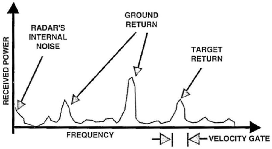 连续波(CW)和脉冲多普勒(PD)雷达通过频率判别,将运动目标(如低空飞行的飞机或行进中的士兵)的反射信号与来自地面的反射信号区分开来。根据多普勒原理(见第8章),雷达波束覆盖范围内的所有物体,其反射回波都会发生频移。每个物体的频移大小与雷达和该物体的相对速度成正比。如图9.32所示,回波可能非常复杂。为了在这些杂乱信号中跟踪某一目标回波,雷达需要专注于目标回波附近的窄频带。由于多普勒回波中的每个频率都对应一个相对速度,这个频率滤波器称为“速度门”,其作用是隔离所需目标回波。在交战过程中,雷达与目标的相对速度可能迅速且大幅变化——例如,两个以马赫1飞行并做6g机动的飞机,其相对速度可能在0到马赫2之间变化,并且变化率可高达每秒400 km/h。随着目标相对速度变化,雷达的速度门会在频率上移动,以保持所需回波在中心位置。此外,目标回波幅度也可能快速变化,因为物体在不同角度下的RCS可能存在显著差异。