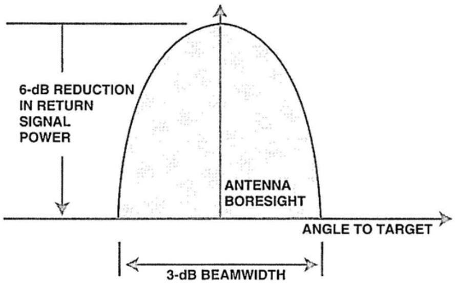 图 9.35 位于天线波束轴线半个波束宽度的目标,其回波功率将降低6 dB。