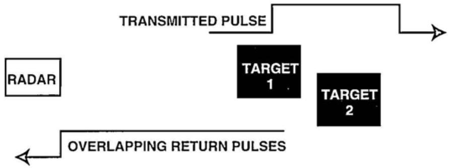 图 9.36 两个目标在距离上相隔一个脉冲宽度时,其回波在时间上相隔一个脉冲宽度。