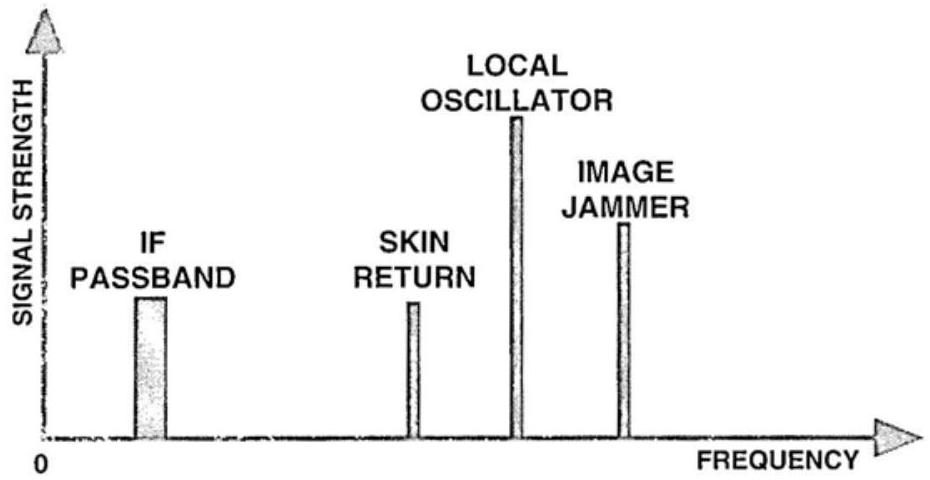 假设某雷达接收机使用高侧变频的本振(如图9.41)。该接收机调谐至接收皮肤回波频率,IF为皮肤回波频率与本振频率的差。如果在镜像频率上接收到与皮肤回波类似的信号,且其功率足以克服前端滤波,该信号也会被雷达的IF放大器放大,并与皮肤回波一起处理。然而,它的相位与真实皮肤回波相反,从而使雷达跟踪误差信号符号反转(即,雷达偏离目标而非朝向目标)。
