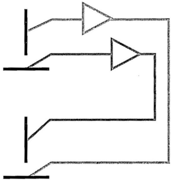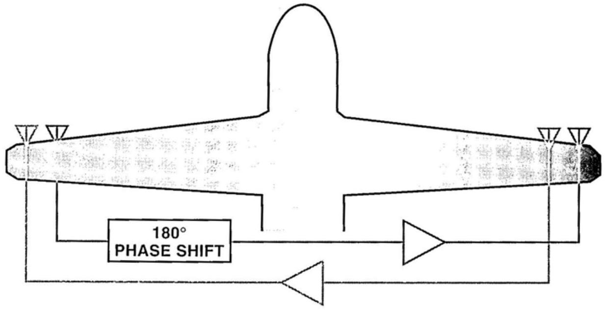 图 9.46 交叉眼干扰机可由安装在飞机翼尖的两个转发环路组成,其中一环路具有\(180^{\circ}\)相移,两条电气路径长度相同。