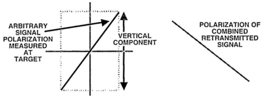 为了生成交叉极化信号,干扰机配备两个正交极化天线的转发通道(即两个线极化天线,极化方向相差\(90^{\circ}\)),如图9.42所示。虽然任何一组正交极化均可,但图中展示为垂直与水平极化。如果接收到的垂直极化信号被以水平极化转发,而接收到的水平极化信号被以垂直极化转发,那么回传信号将与原始接收信号交叉极化,如图9.43所示。