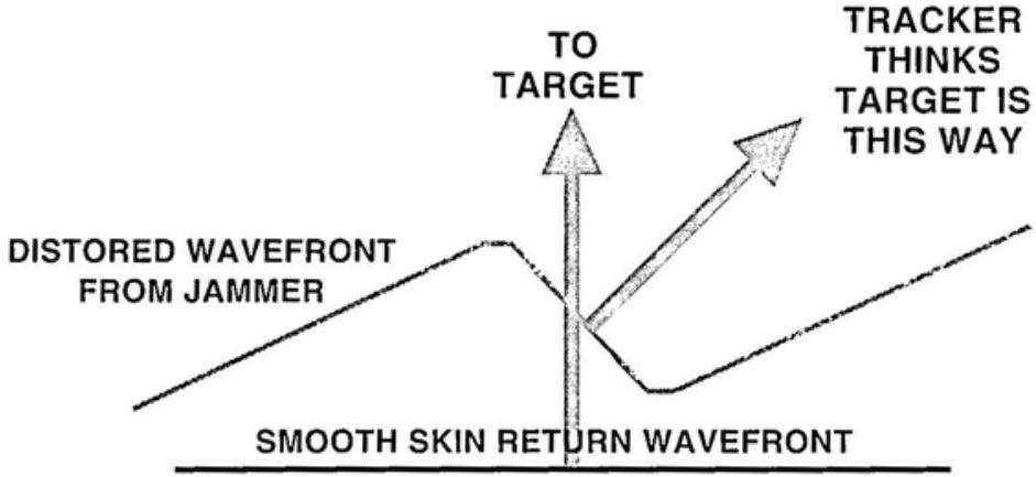 现在考虑雷达跟踪机制对该合成信号的反应:皮肤回波最小值出现时的天线扫描角度现在成为最大信号功率角度,因此跟踪器将雷达扫描引向远离目标而不是指向目标。当干扰成功时,这会使雷达跟踪偏离目标,直到雷达丢失目标并被迫尝试重新捕获并重新开始跟踪过程。