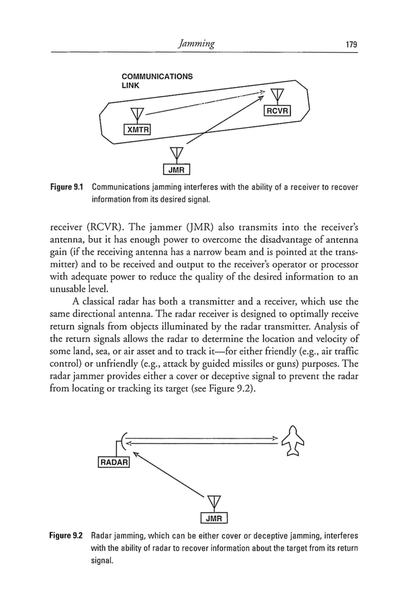 通信干扰(COMJAM)是对通信信号的干扰。这通常被认为是对战术HF、VHF和UHF信号的干扰,使用噪声调制的掩护干扰,但它也可以是对点对点微波通信链路或远程资产指挥与数据链路的干扰。如图9.1所示,敌方的通信链路将信号从发射机(XMTR)传送到接收机(RCVR)。干扰机(JMR)也向接收机天线发射信号,但其功率足够强,可以克服天线增益的不利因素(如果接收天线为窄波束并对准发射机),并使信号以足够的功率被接收并输出给接收机操作员或处理器,从而将所需信息的质量降低到不可用水平。