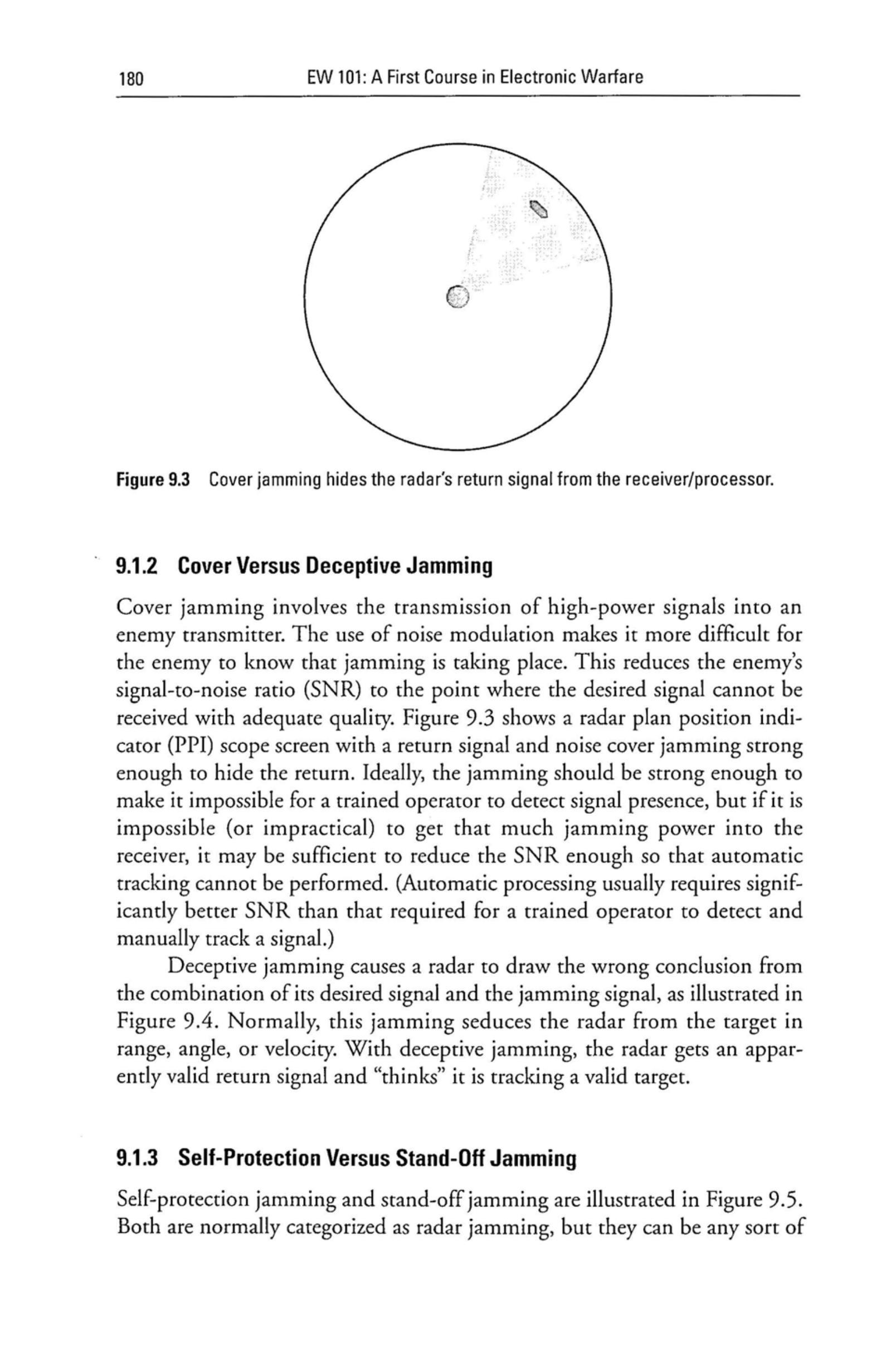掩护干扰是将高功率信号发射到敌方接收机中。采用噪声调制使敌方更难察觉正在进行干扰。这会将敌方的信噪比(SNR)降低到所需信号无法以足够质量接收的程度。图9.3显示了雷达平面位置指示器(PPI)示波器上的回波信号以及足够强大的噪声掩护干扰。理想情况下,干扰应强到足以使训练有素的操作员完全无法检测到信号存在;但如果无法(或不切实际)将如此大的干扰功率注入接收机,则只需将SNR降低到使自动跟踪无法执行的程度即可。(自动处理通常要求的SNR显著高于训练有素操作员检测和手动跟踪信号所需的SNR。)