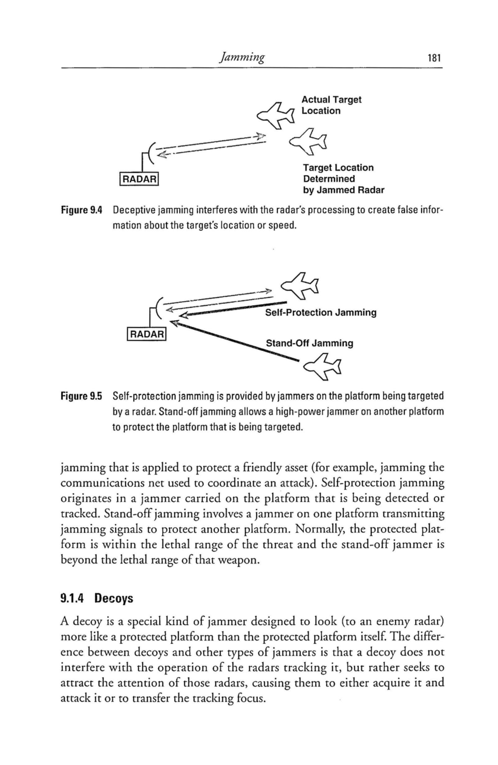 一个典型雷达同时具有发射机和接收机,并共用同一副定向天线。雷达接收机被设计为最佳接收由雷达发射机照射目标返回的信号。通过分析回波信号,雷达可以确定陆、海、空资产的位置和速度并跟踪之——无论是友方用途(如空管)还是敌方用途(如导弹或火炮攻击)。雷达干扰机通过提供掩护或欺骗信号来阻止雷达定位或跟踪目标(见图9.2)。