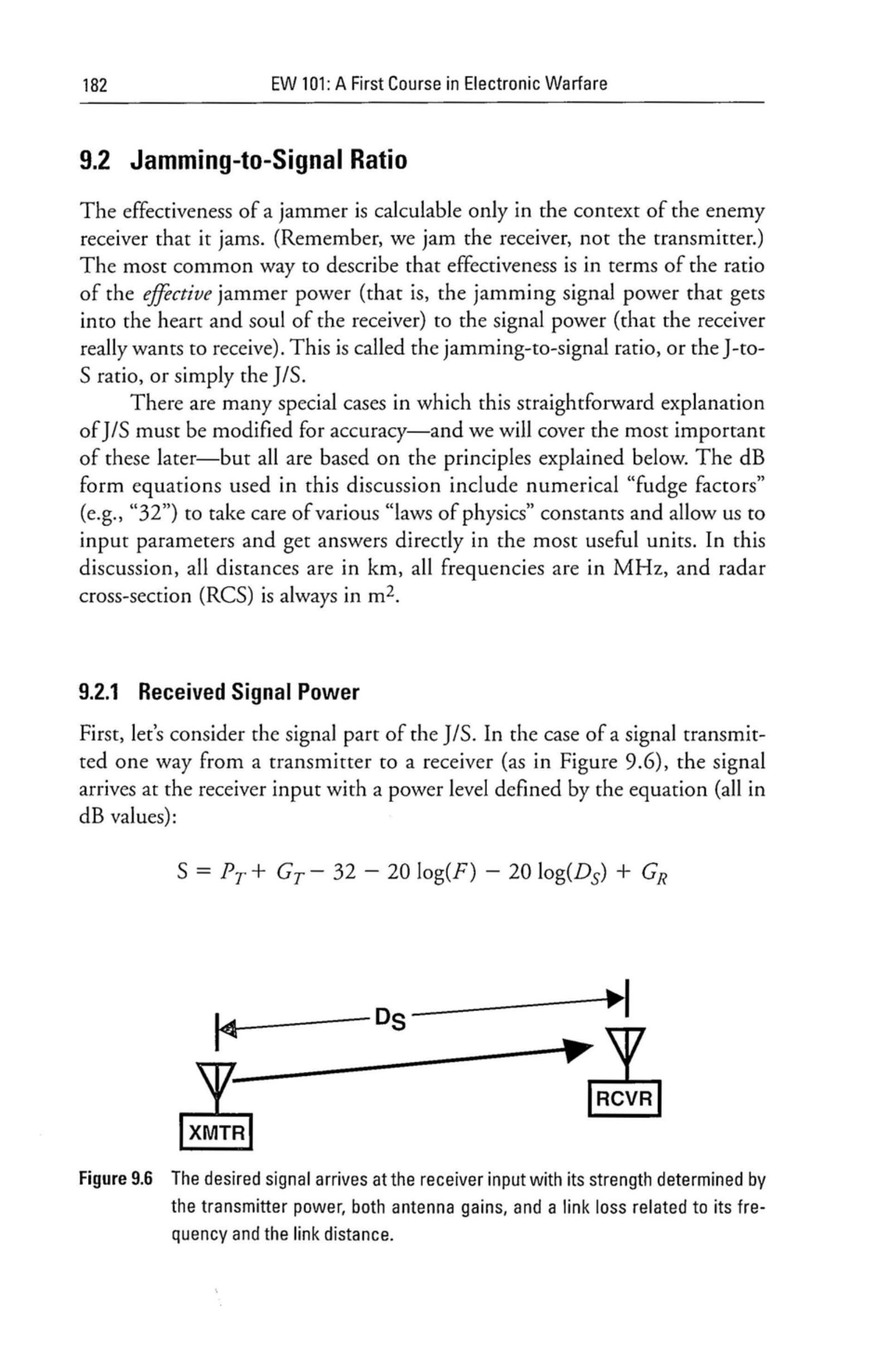 首先考虑\(\mathrm{J}/\mathrm{S}\)中的信号部分。对于从发射机到接收机的一路传输信号(如图9.6所示),信号到达接收机输入端的功率由下式决定(所有量均为dB值):