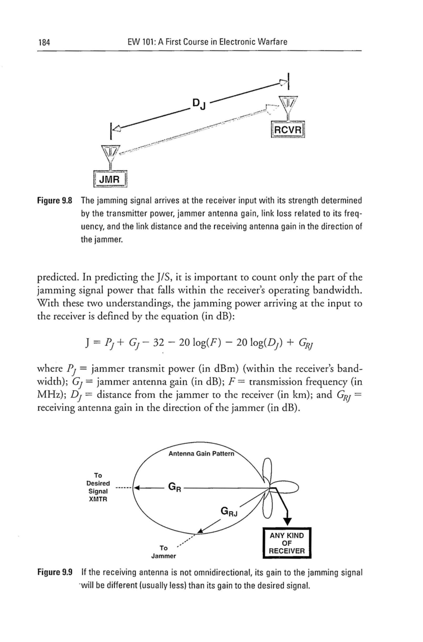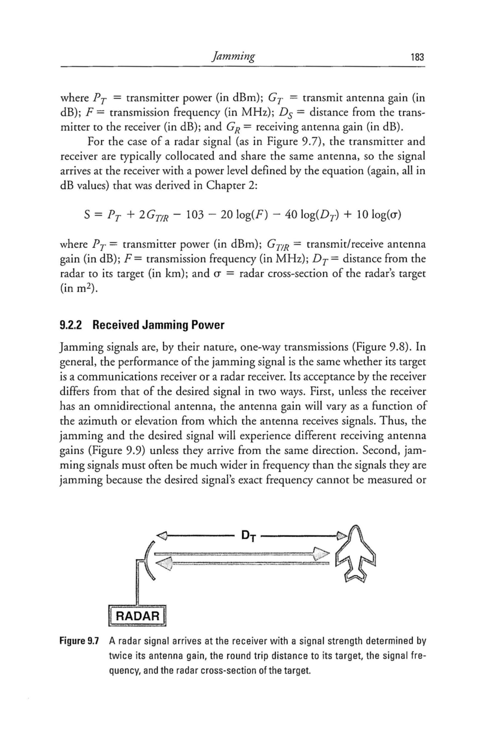 图 9.8 干扰信号到达接收机输入,其强度由发射功率、干扰机天线增益、与频率相关的链路损耗、链路距离以及接收天线在干扰方向上的增益决定。