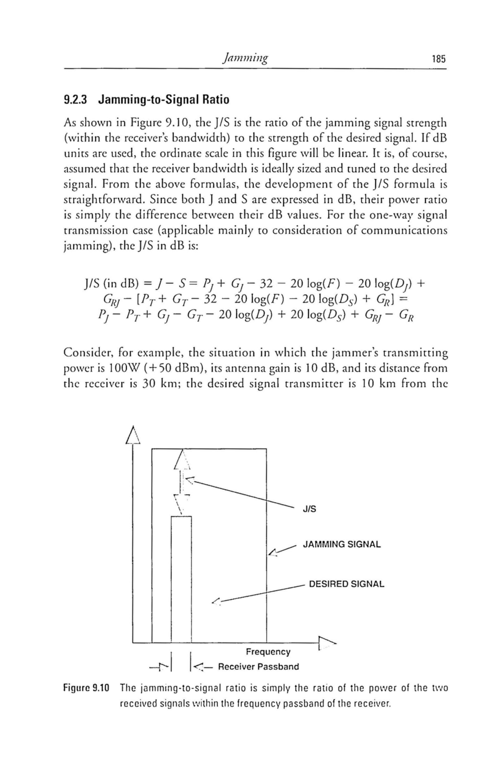 有效干扰所需的J/S比可能在0至40 dB甚至更高,具体取决于所采用的干扰类型以及所需信号的调制特性。在讨论具体干扰类型时,将包括所需的\(\mathrm{J}/\mathrm{S}\)。由于\(10\ \mathrm{dB}\) J/S是一个适用于许多情况的整数量,因此在本讨论中将其定义为“足够”。