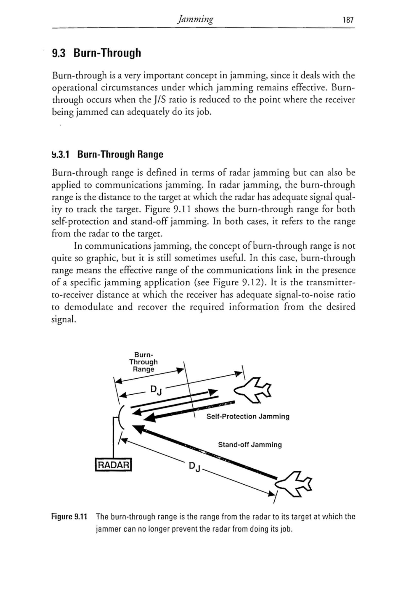 突破距离通常以雷达干扰来定义,但也可应用于通信干扰。在雷达干扰中,突破距离是指雷达到目标的距离,此时雷达信号质量足以跟踪目标。图9.11展示了自卫干扰和支援干扰的突破距离。在这两种情况下,它都指的是雷达到目标的距离。