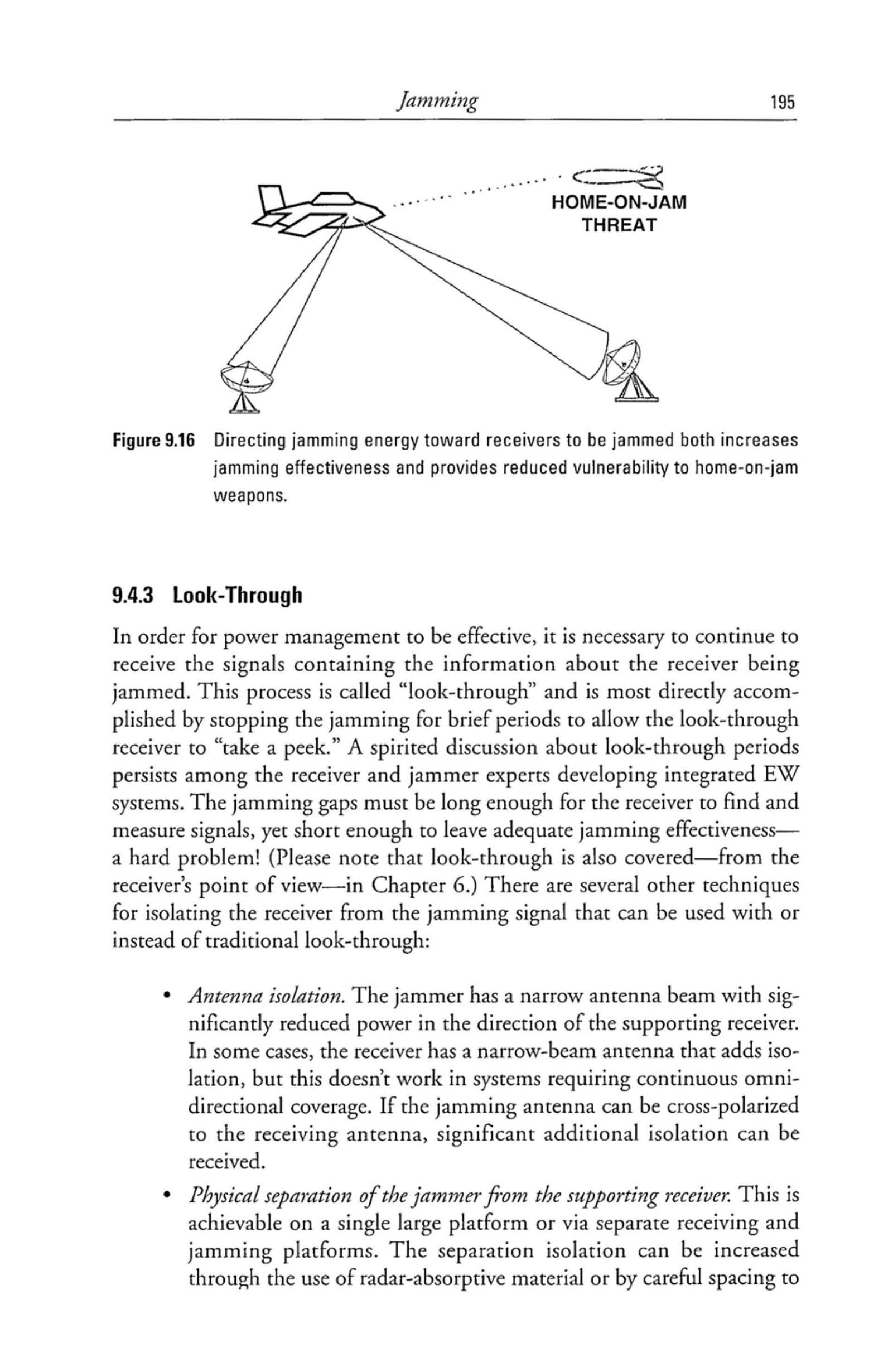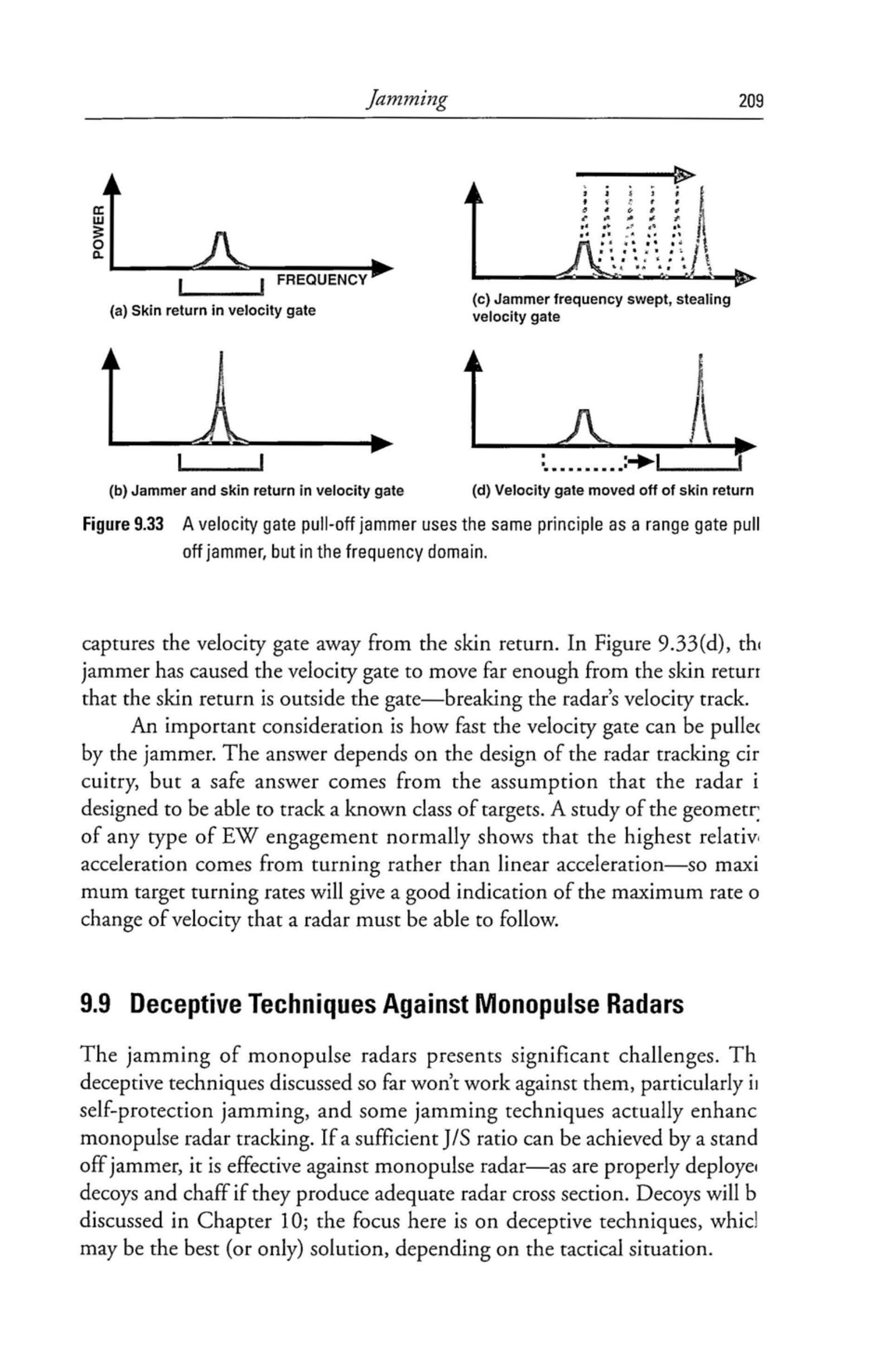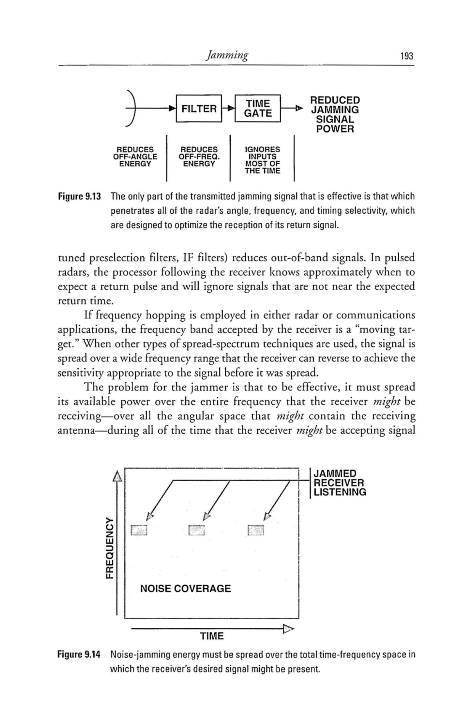 遗憾的是,该技术要求对雷达设计有较深入的了解,而不仅仅是其发射频率(即皮肤回波频率,不含多普勒移频)。必须知道雷达使用的是高侧还是低侧变频。如果雷达接收机的前端滤波很弱甚至没有调谐,则该技术只需中等\(\mathrm{J}/\mathrm{S}\)比即可奏效;但若滤波器选择性强,则可能需要60 dB甚至更高的\(\mathrm{J}/\mathrm{S}\)。