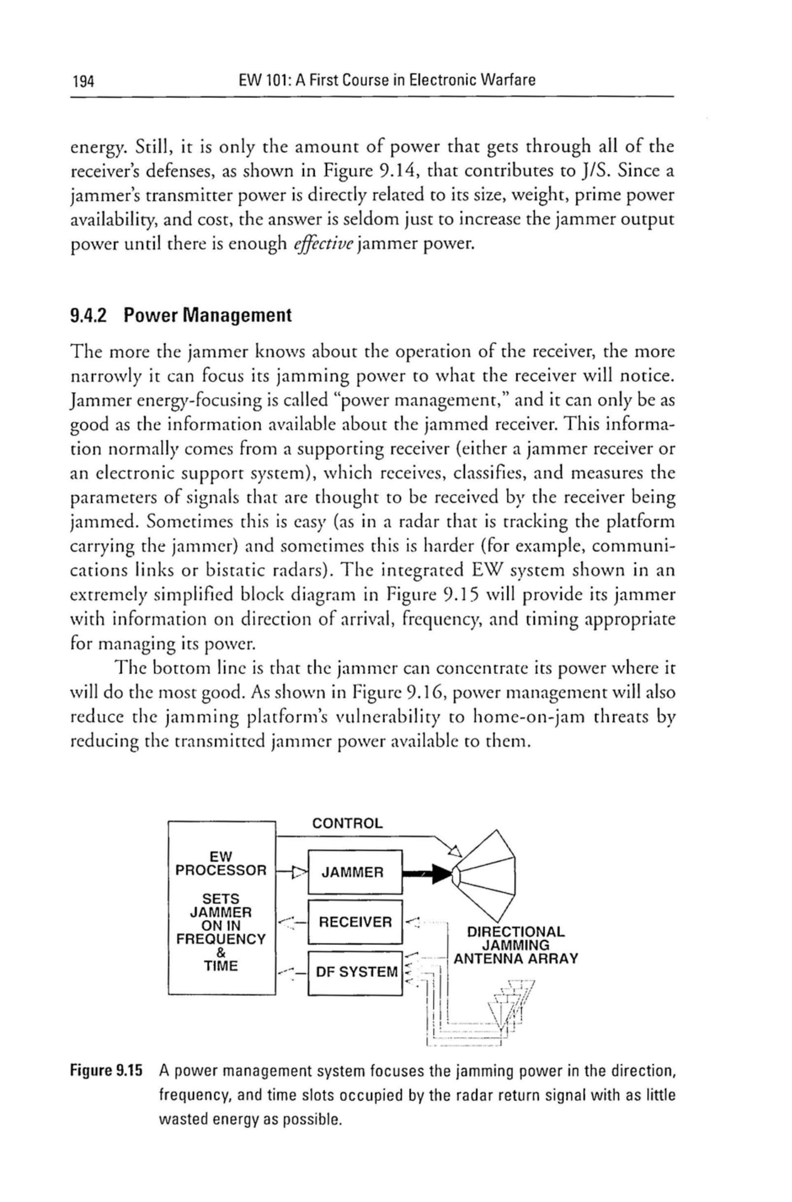 压制式干扰通常使用噪声调制,其作用是尽可能降低被干扰接收机的信噪比。欺骗式干扰则使雷达对其试图跟踪的目标位置或速度得出错误结论。本节重点讨论压制式干扰,包括功率管理这一最大化干扰效果的概念。