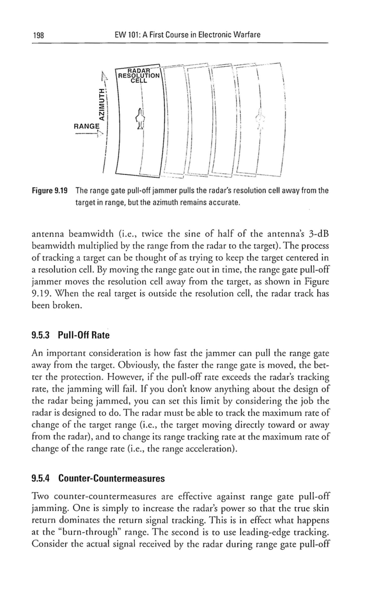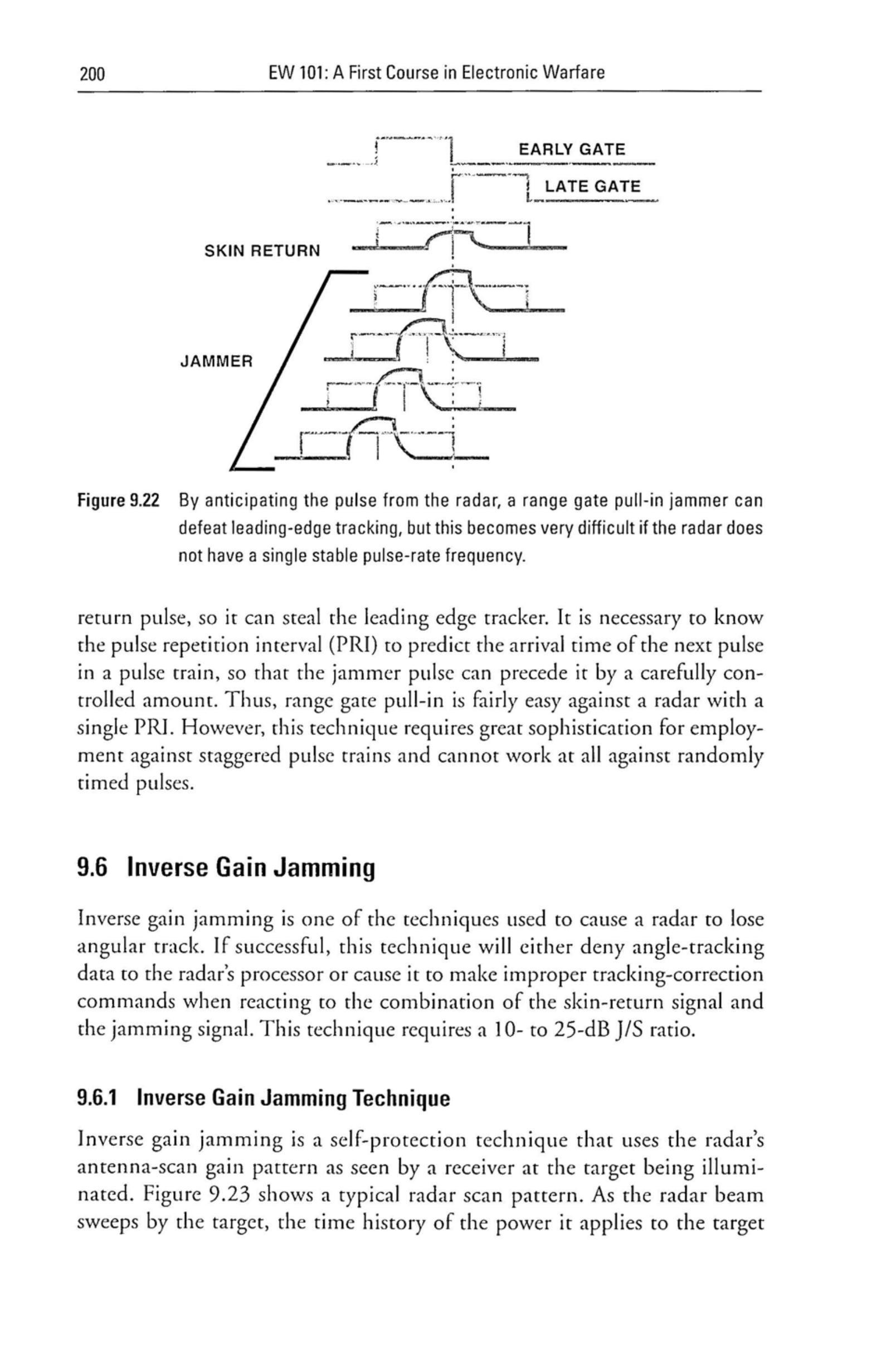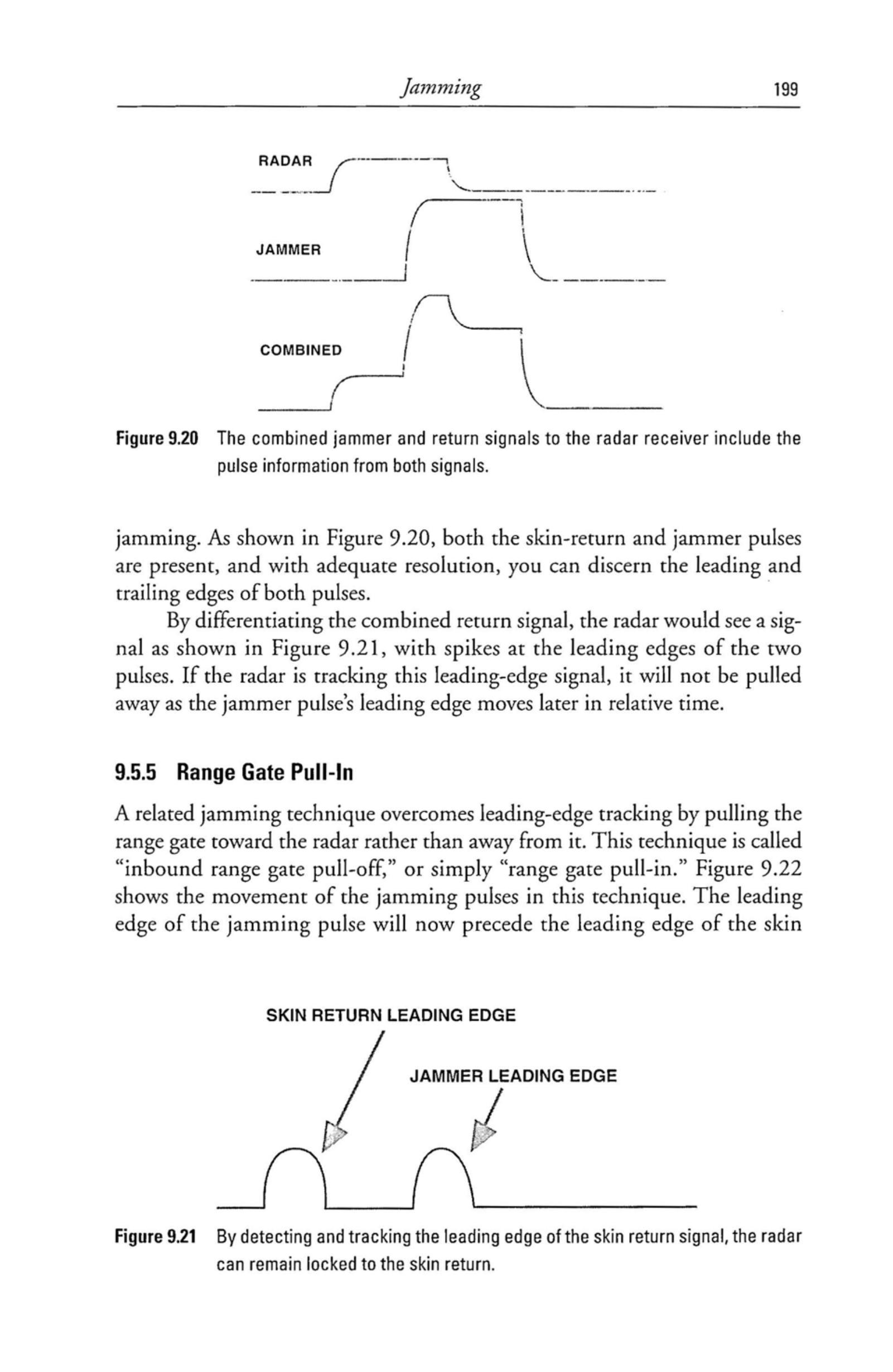 一种相关的干扰技术通过将距离门朝向雷达而不是远离雷拉来克服前沿跟踪。这种技术称为“内向距离门拖曳(inbound range gate pull-off)”,或简称“距离门拉入(range gate pull-in)”。图9.22展示了这种技术下干扰脉冲的移动情况。干扰脉冲的前沿将领先于皮肤回波的前沿,从而“窃取”前沿跟踪器。为了预测下一脉冲的到达时间,使干扰脉冲能够提前一个精确控制的时间量,必须知道脉冲重复间隔(PRI)。因此,对于具有单一PRI的雷达,距离门拉入相对容易。但对于交错脉冲列,该技术需要很高的复杂度,而对于随机时序脉冲则完全无效。