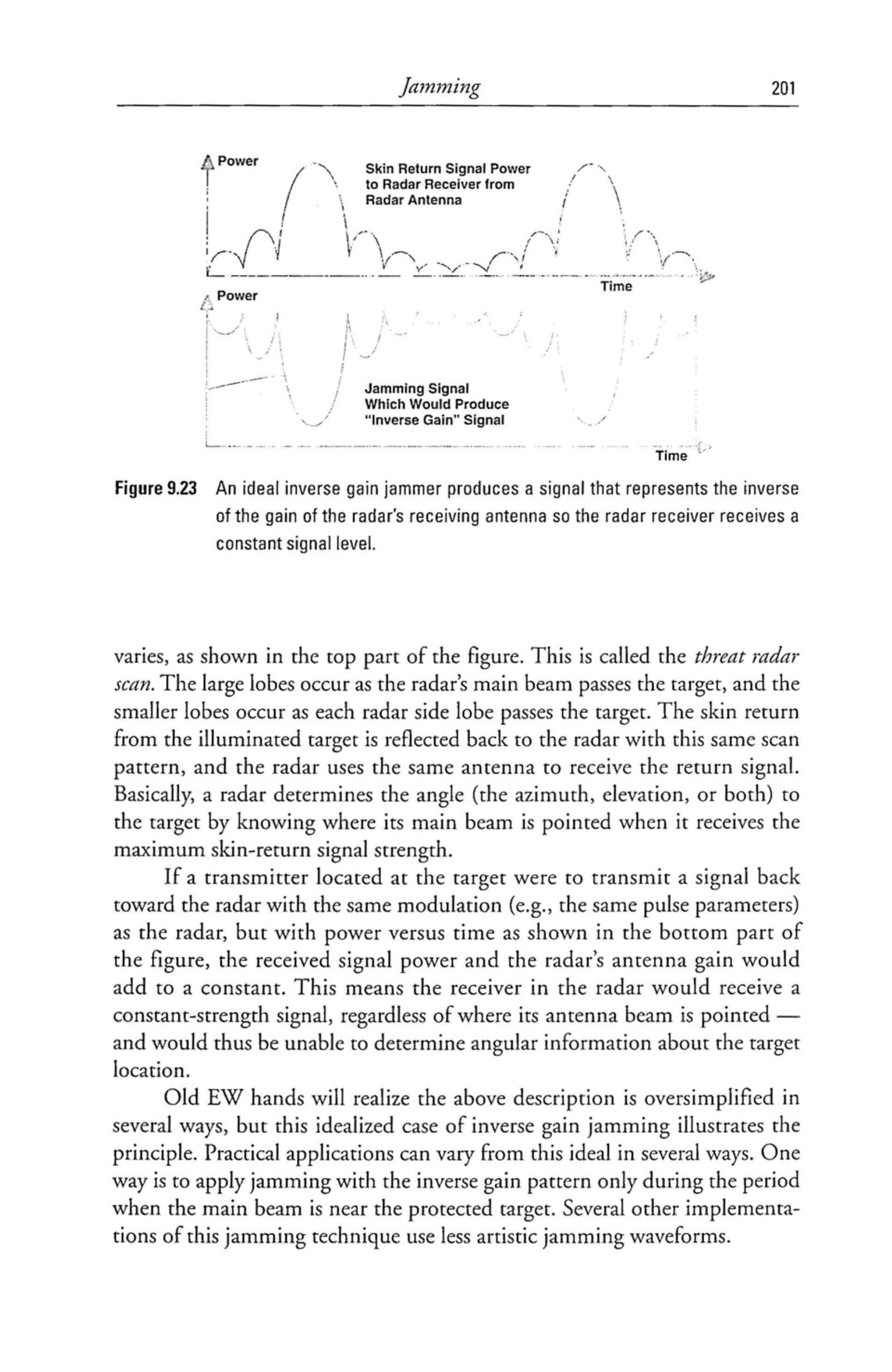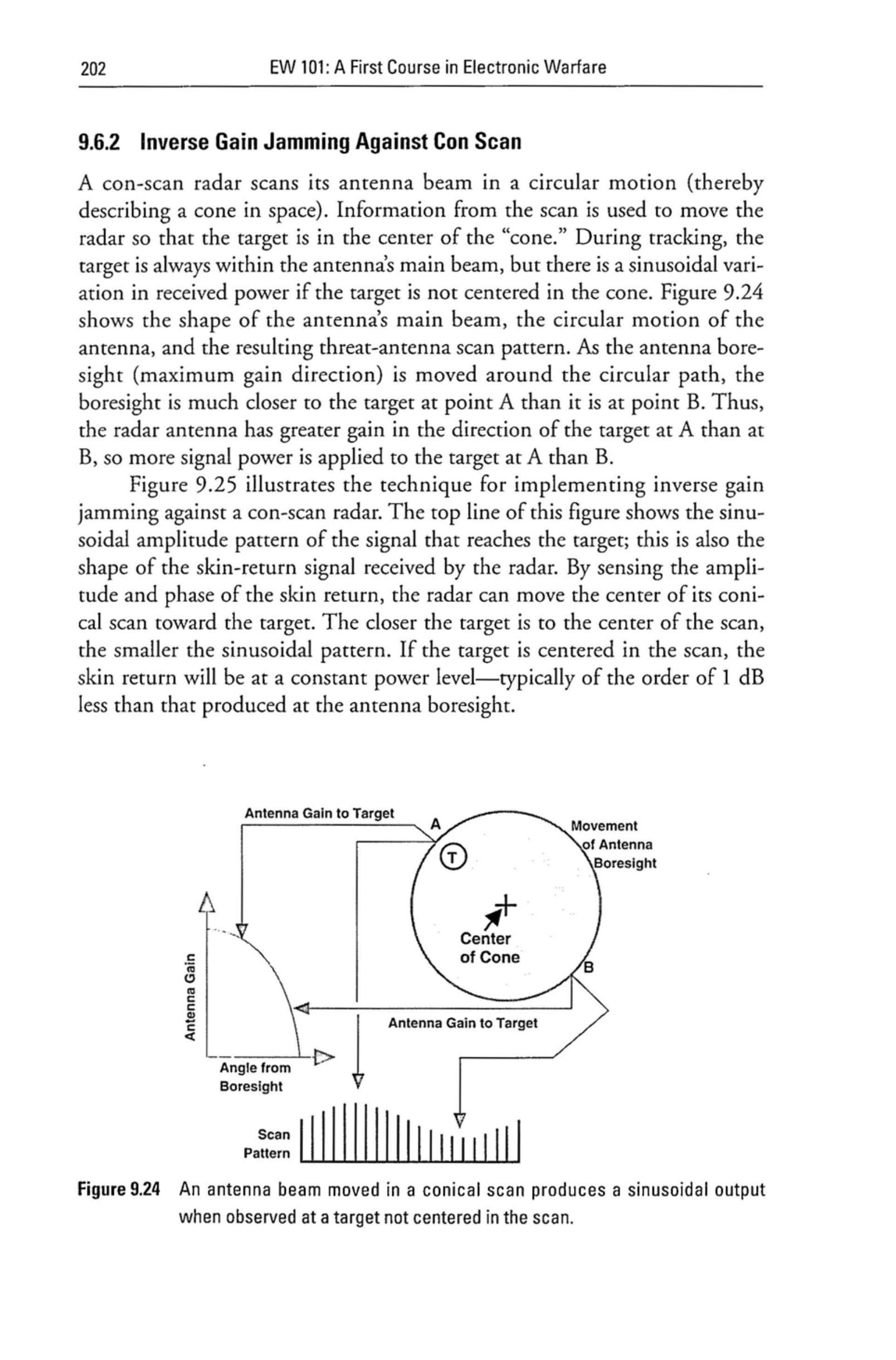 图9.25说明了针对圆锥扫描雷达实施反增益干扰的技术。图顶线显示了到达目标的信号的正弦幅度模式;这也是雷达接收到的皮肤回波形状。通过感知皮肤回波的幅度和相位,雷达可以将圆锥扫描的中心调整到目标方向。目标越接近扫描中心,正弦模式越小。如果目标恰好在扫描中心,皮肤回波功率将保持恒定——通常比天线波束最大增益方向的功率低约1 dB。