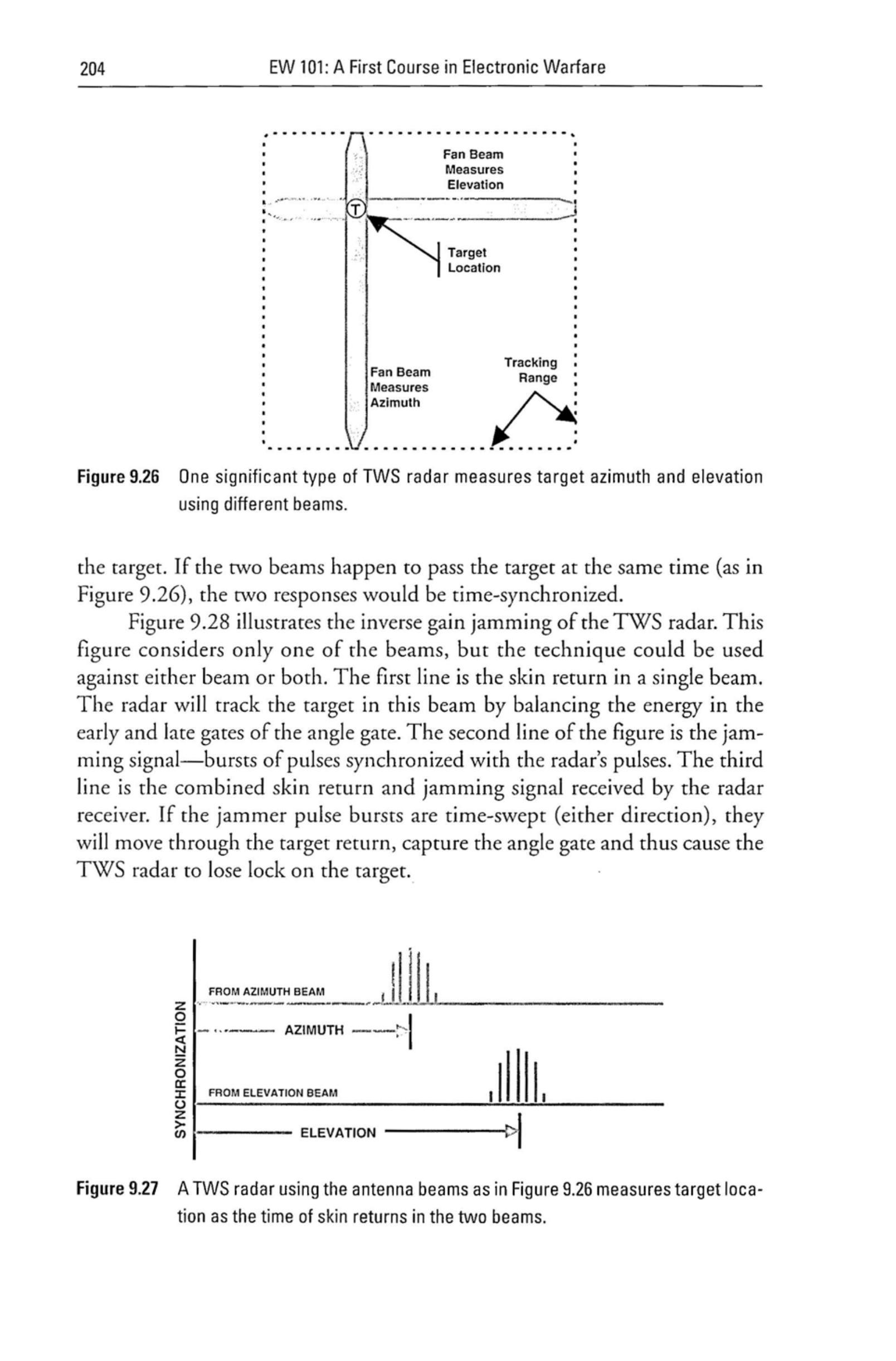 图9.26展示了“边扫描边跟踪(TWS)”雷达的概念,该雷达使用两束扇形波束。这两束波束以不同频率发射(并接收)信号。一束用于测量所有目标的俯仰角,另一束用于测量方位角——因此雷达能够同时知道跟踪范围内多个目标的位置。该图表示了跟踪发生的角度空间;距离则通过反射脉冲的到达时间来测量。