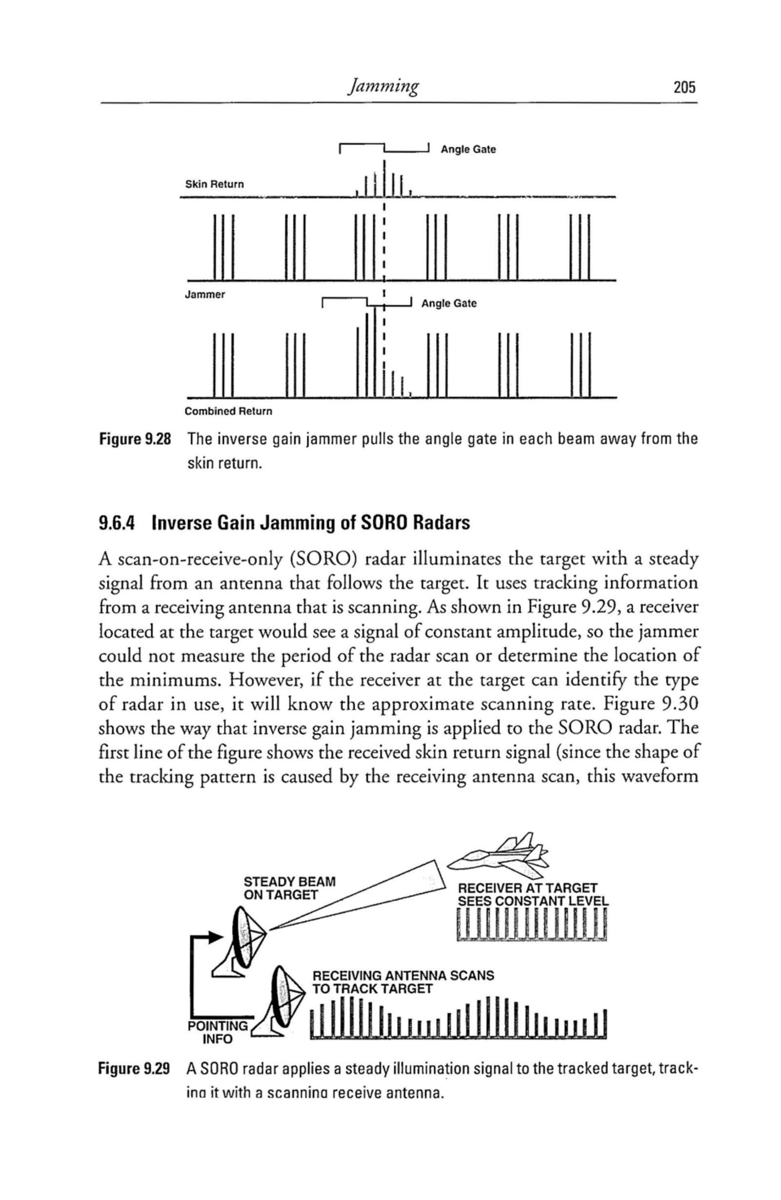 “仅接收扫描(SORO)”雷达使用一部跟随目标的天线发射稳定信号,并利用扫描接收天线获取跟踪信息。如图9.29所示,位于目标处的接收机将看到一个恒幅信号,因此干扰机无法测量雷达扫描周期或确定最小值的位置。然而,如果目标处的接收机能够识别所用雷达的类型,它就会知道接收天线的大致扫描速率。图9.30展示了对SORO雷达实施反增益干扰的方法。图第一行显示了接收到的皮肤回波信号(由于跟踪图样是由接收天线扫描引起的,该波形只存在于雷达内部)。如图第二行所示,干扰机产生与雷达脉冲同步的脉冲突发。突发速率略高或略低于假设的接收天线扫描速率,从而使突发信号“穿过”接收天线的扫描图样,如图第三行所示。尽管这种干扰突发模式不会像与雷达扫描完全同步那样持续产生\(180^{\circ}\)的跟踪误差,但它几乎总会导致错误的跟踪信号。