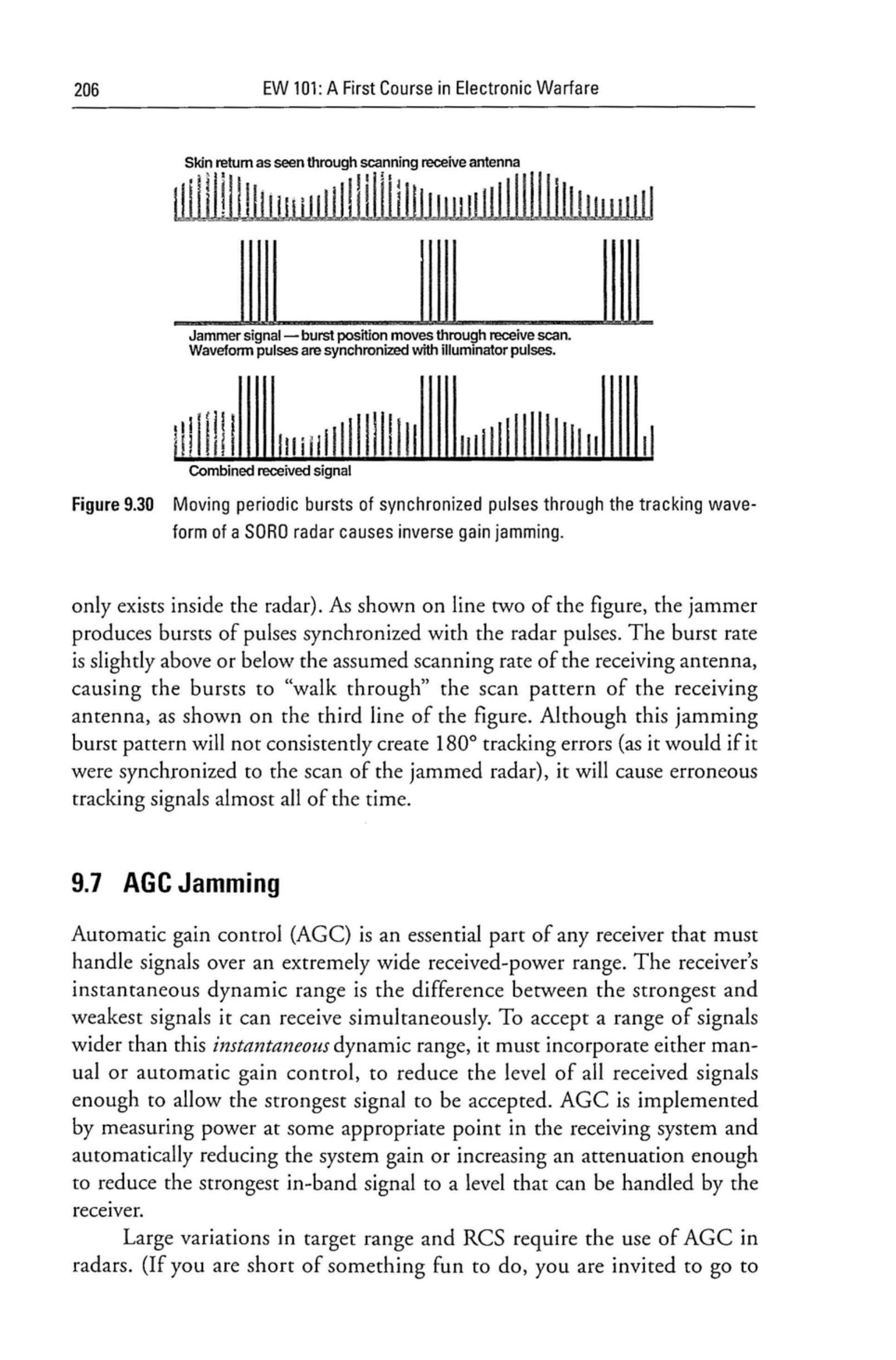 AGC干扰机以大约等于雷达天线扫描速率的频率发射极强脉冲。如图9.31所示,这些脉冲捕获了雷达的AGC。由此导致的增益降低使所有带内信号大幅度衰减。皮肤回波信号被抑制到极低水平,以至于雷达无法有效跟踪目标。