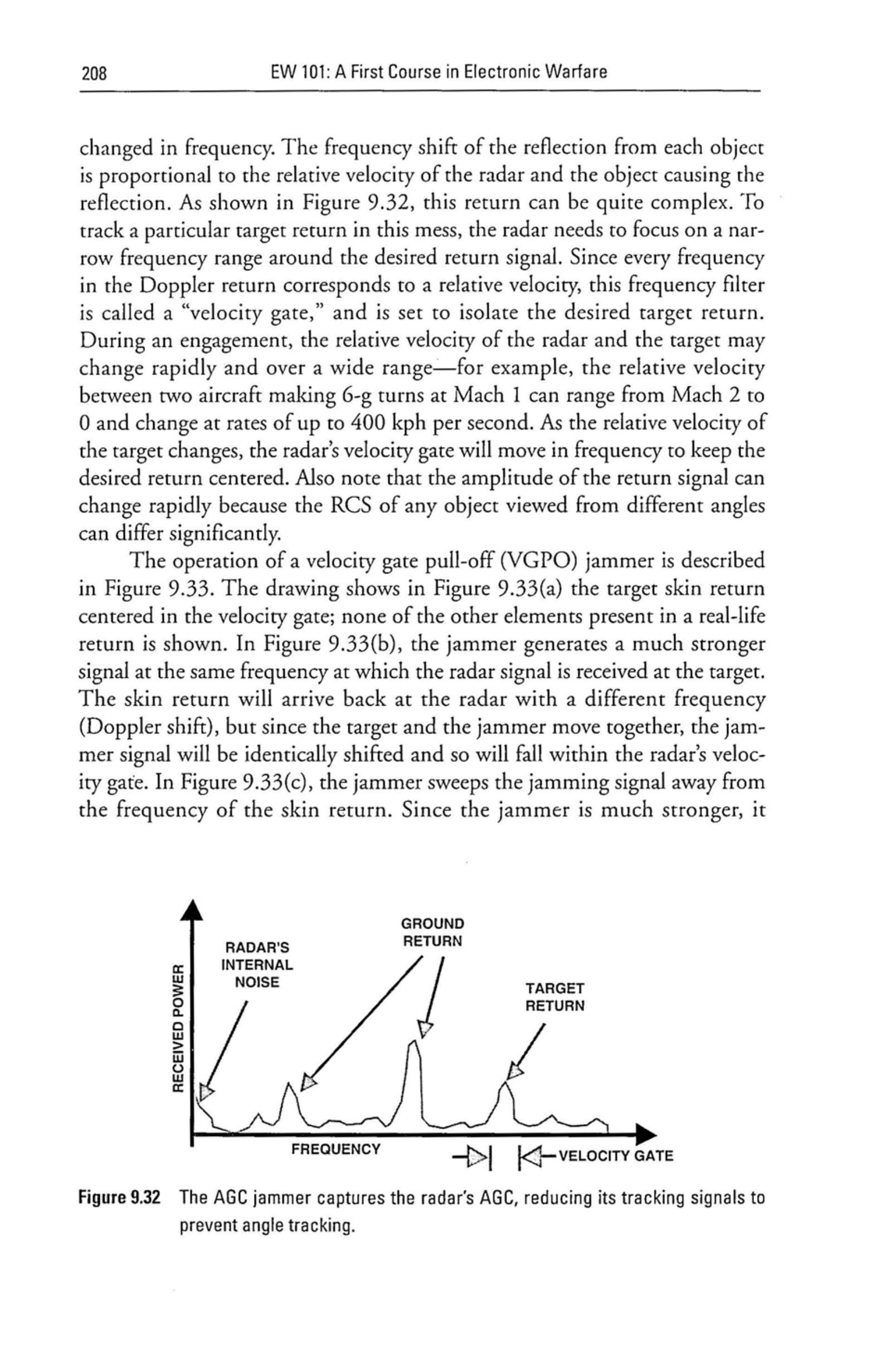 连续波(CW)和脉冲多普勒(PD)雷达通过频率判别,将运动目标(如低空飞行的飞机或行进中的士兵)的反射信号与来自地面的反射信号区分开来。根据多普勒原理(见第8章),雷达波束覆盖范围内的所有物体,其反射回波都会发生频移。每个物体的频移大小与雷达和该物体的相对速度成正比。如图9.32所示,回波可能非常复杂。为了在这些杂乱信号中跟踪某一目标回波,雷达需要专注于目标回波附近的窄频带。由于多普勒回波中的每个频率都对应一个相对速度,这个频率滤波器称为“速度门”,其作用是隔离所需目标回波。在交战过程中,雷达与目标的相对速度可能迅速且大幅变化——例如,两个以马赫1飞行并做6g机动的飞机,其相对速度可能在0到马赫2之间变化,并且变化率可高达每秒400 km/h。随着目标相对速度变化,雷达的速度门会在频率上移动,以保持所需回波在中心位置。此外,目标回波幅度也可能快速变化,因为物体在不同角度下的RCS可能存在显著差异。