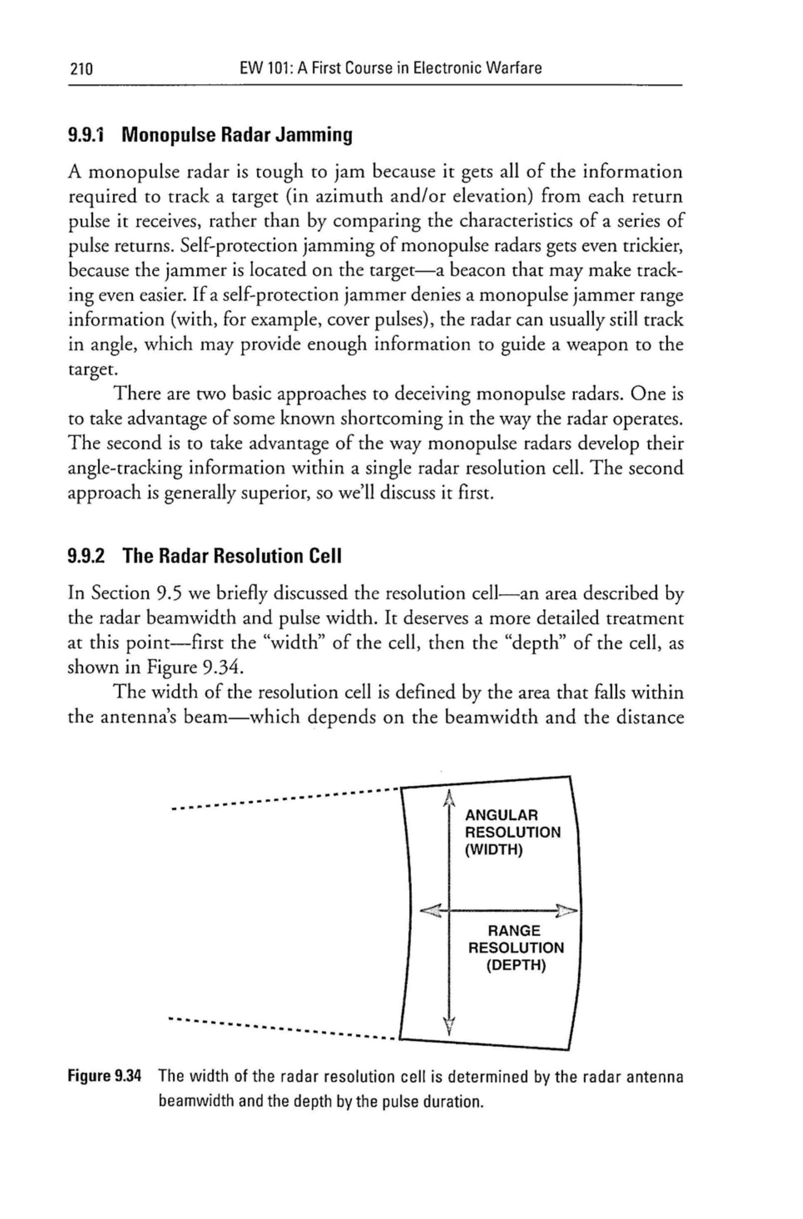 在第9.5节我们简要讨论了分辨单元——由雷达波束宽度和脉冲宽度所定义的区域。在这里,它值得更详细的讨论——先是单元的“宽度”,然后是“深度”,如图9.34所示。