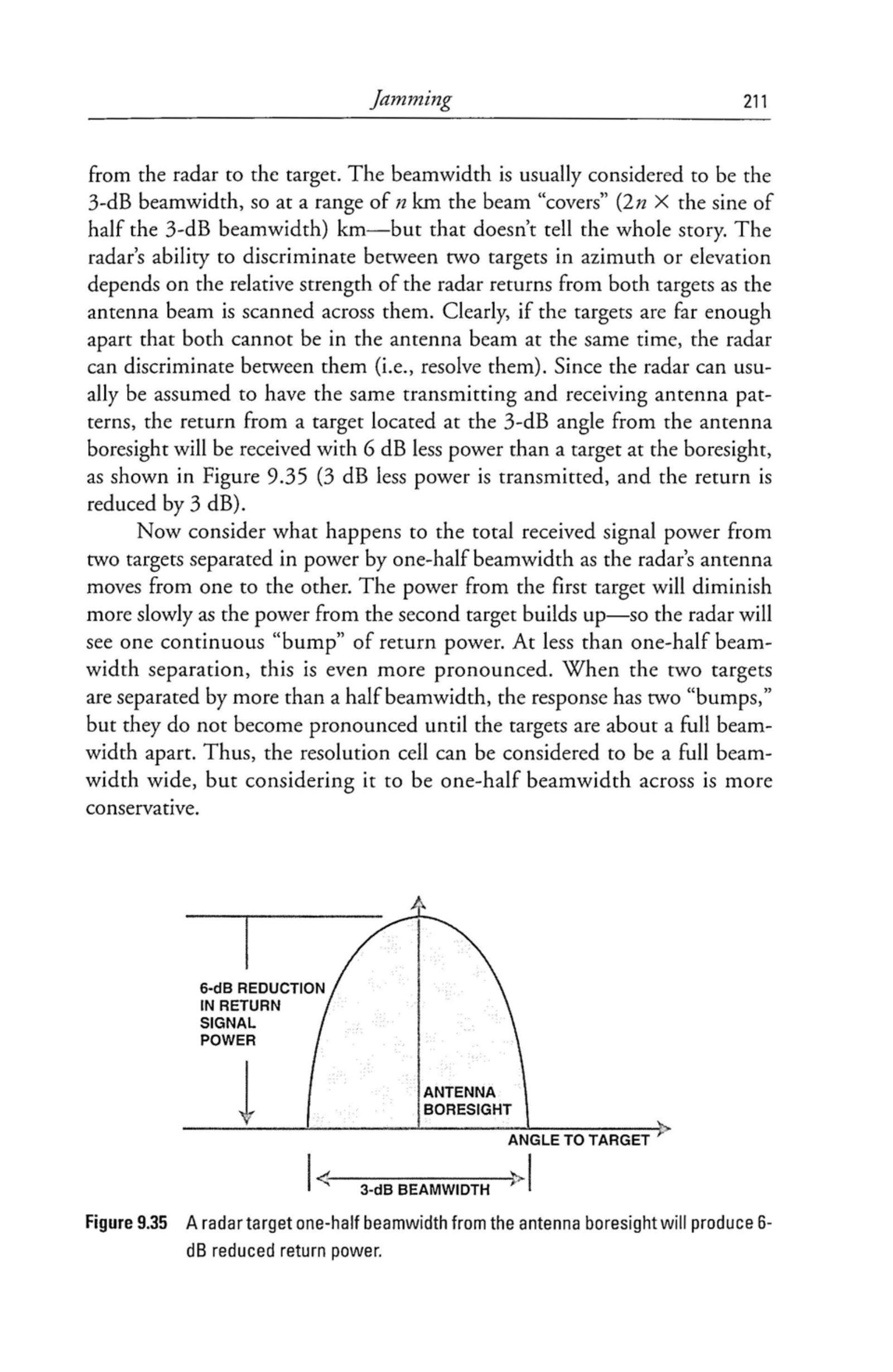 分辨单元的宽度由天线波束范围决定——取决于波束宽度以及雷达到目标的距离。波束宽度通常认为是3 dB波束宽度,因此在\(n \ \mathrm{km}\)的距离上,波束覆盖\((2n \times \sin(\tfrac{1}{2}\text{3dB波束宽度}))\) km——但这并不能完整描述情况。雷达能否在方位或俯仰上区分两个目标,取决于天线波束扫过它们时两目标回波的相对强度。显然,如果两目标相距足够远,以至于它们不能同时位于天线波束内,雷达就能区分它们(即“分辨”)。由于雷达发射和接收天线模式通常相同,位于天线波束轴线3 dB角度处的目标,其接收回波功率将比位于波束轴线的目标低6 dB(发射功率减少3 dB,回波再减少3 dB),如图9.35所示。