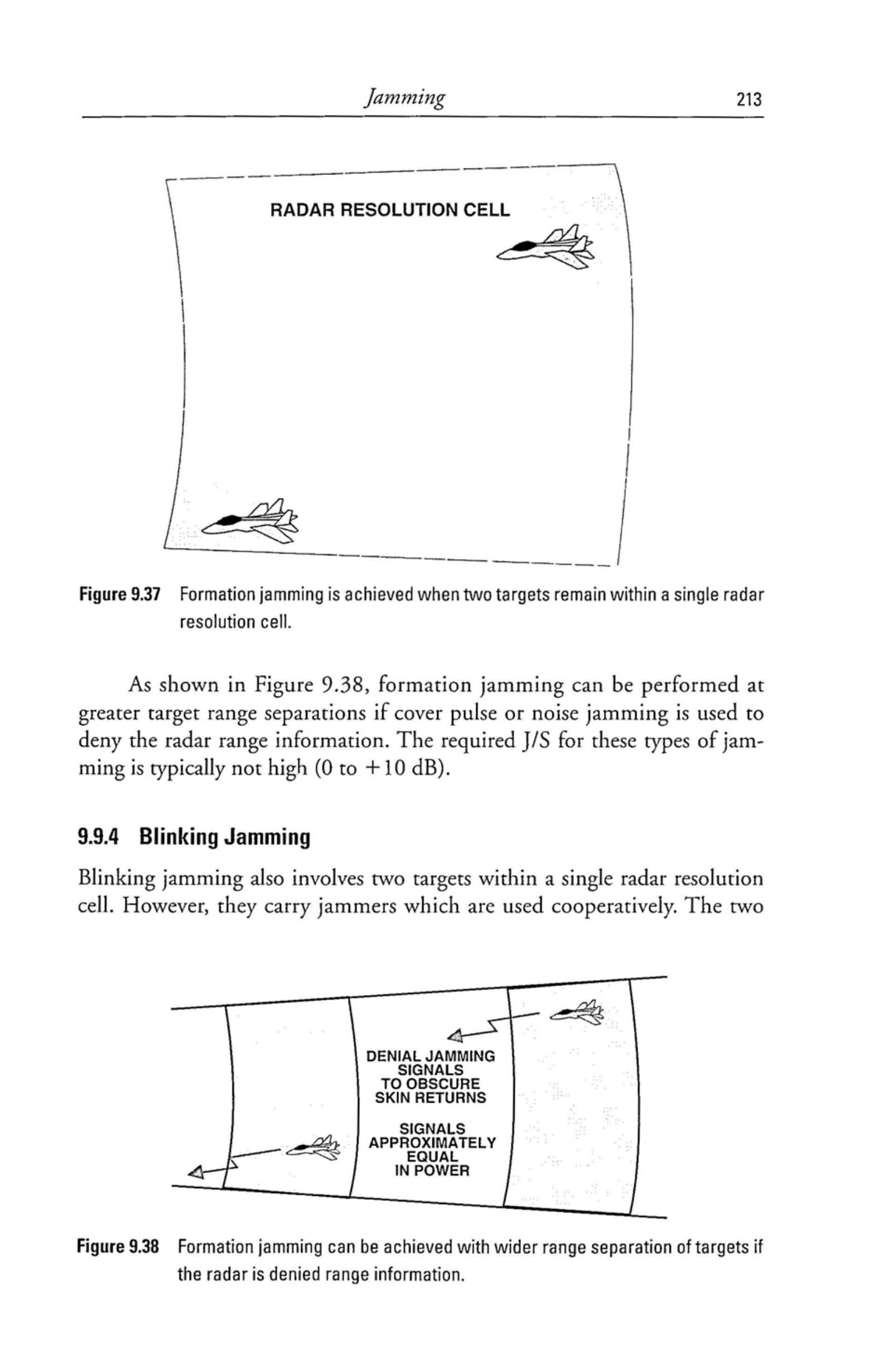 如图9.38所示,如果采用压制脉冲或噪声干扰以剥夺雷达的距离信息,编队干扰可以在目标距离分离更大的情况下实施。这类干扰通常所需的\(\mathrm{J}/\mathrm{S}\)较低(0至+10 dB)。