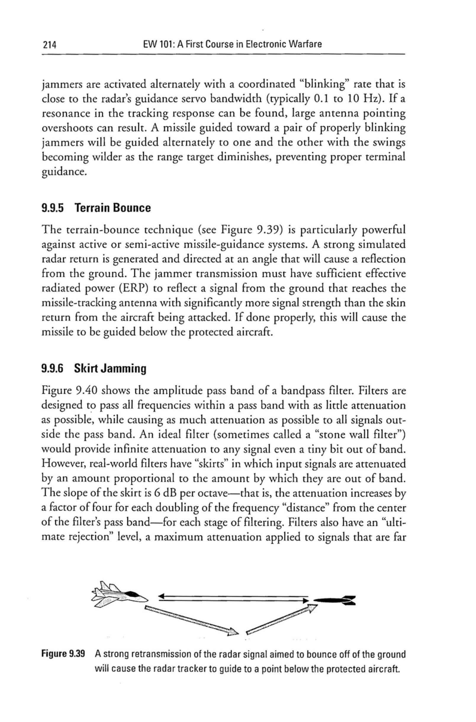 地形反射干扰技术(见图9.39)对主动或半主动导引的导弹制导系统尤为有效。该方法生成一个强大的模拟雷达回波,并以一定角度发射,使其从地面反射。干扰机的发射必须具有足够的有效辐射功率(ERP),以保证地面反射信号到达导弹跟踪天线时,其强度显著超过被攻击飞机的皮肤回波。如果实施得当,这将使导弹被引导至受保护飞机下方。