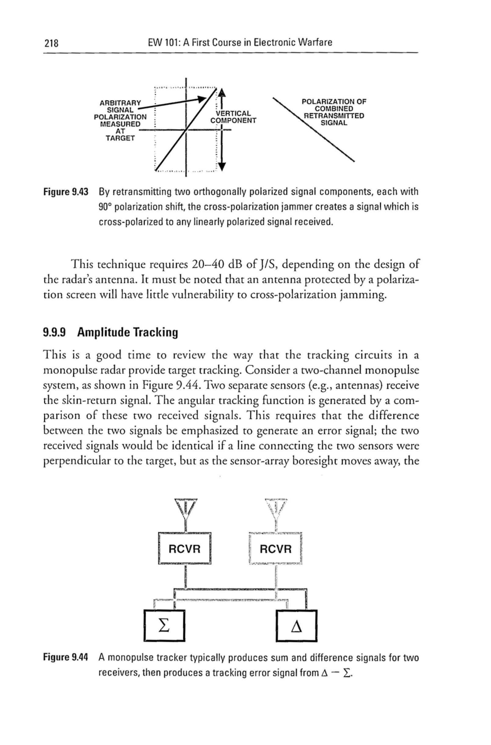 单脉冲雷达的干扰极具挑战性。迄今讨论的欺骗技术对其无效,特别是在自卫干扰中,某些干扰技术甚至会增强单脉冲雷达的跟踪。如果支援干扰机能够提供足够的\(\mathrm{J}/\mathrm{S}\)比,它对单脉冲雷达是有效的——同样,如果诱饵和箔条能提供足够的雷达截面积,它们也是有效的。第10章将讨论诱饵;这里重点讨论欺骗技术,根据战术情况,这些技术可能是最佳(甚至唯一)的解决方案。