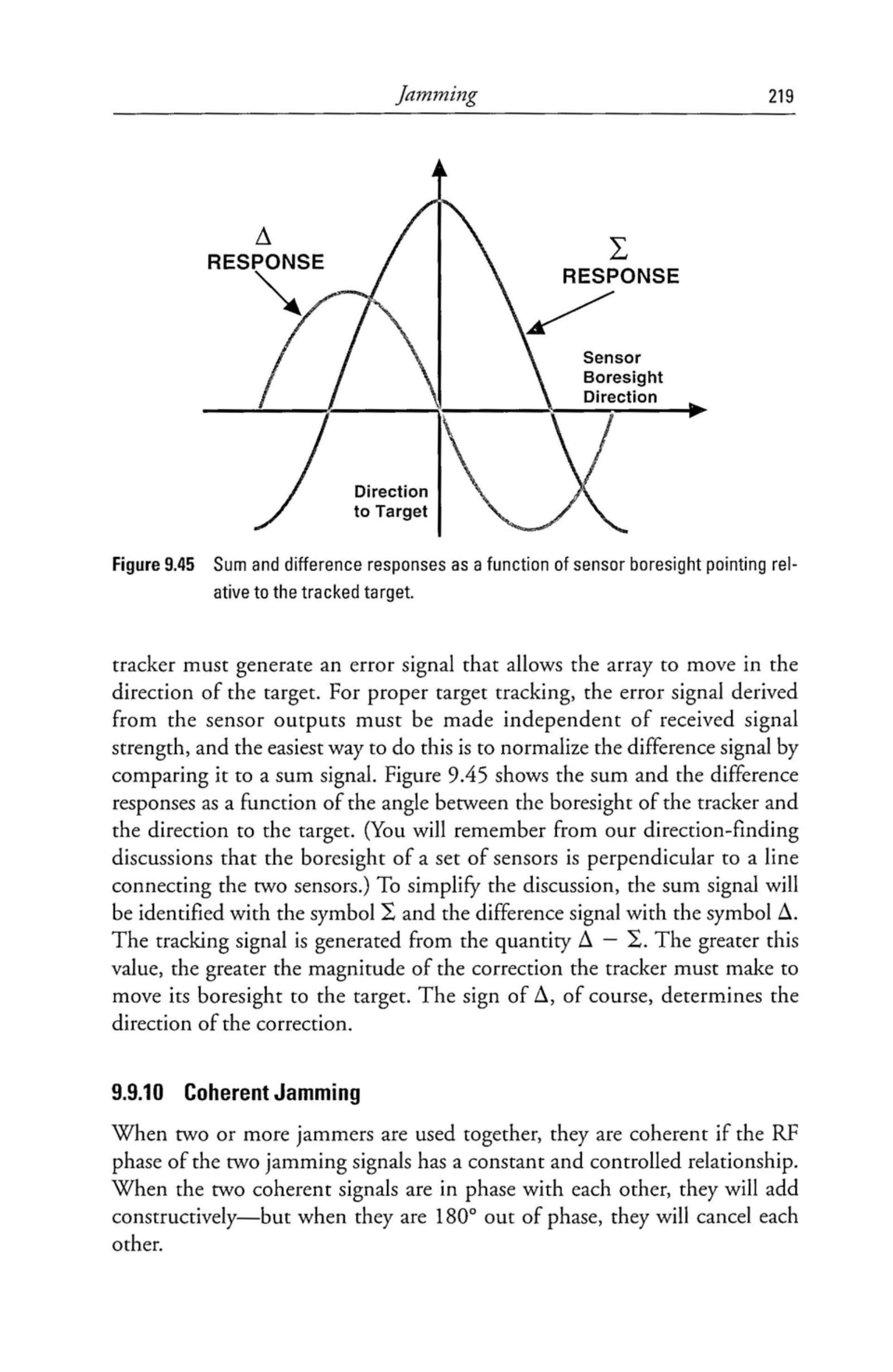 交叉眼干扰应用有两个主要限制:其一,两条转发路径的电气长度必须高度匹配(通常要求在5电气度以内)。这非常困难,因为电缆、波导等的电气“长度”会随温度和信号强度变化。(请注意,在典型雷达频率下,\(5^{\circ}\)对应的电长度小于1毫米。)其二,该技术需要非常高的\(\mathrm{J}/\mathrm{S}\)比(20 dB或以上),因为空零必须足够强以压制和信号。