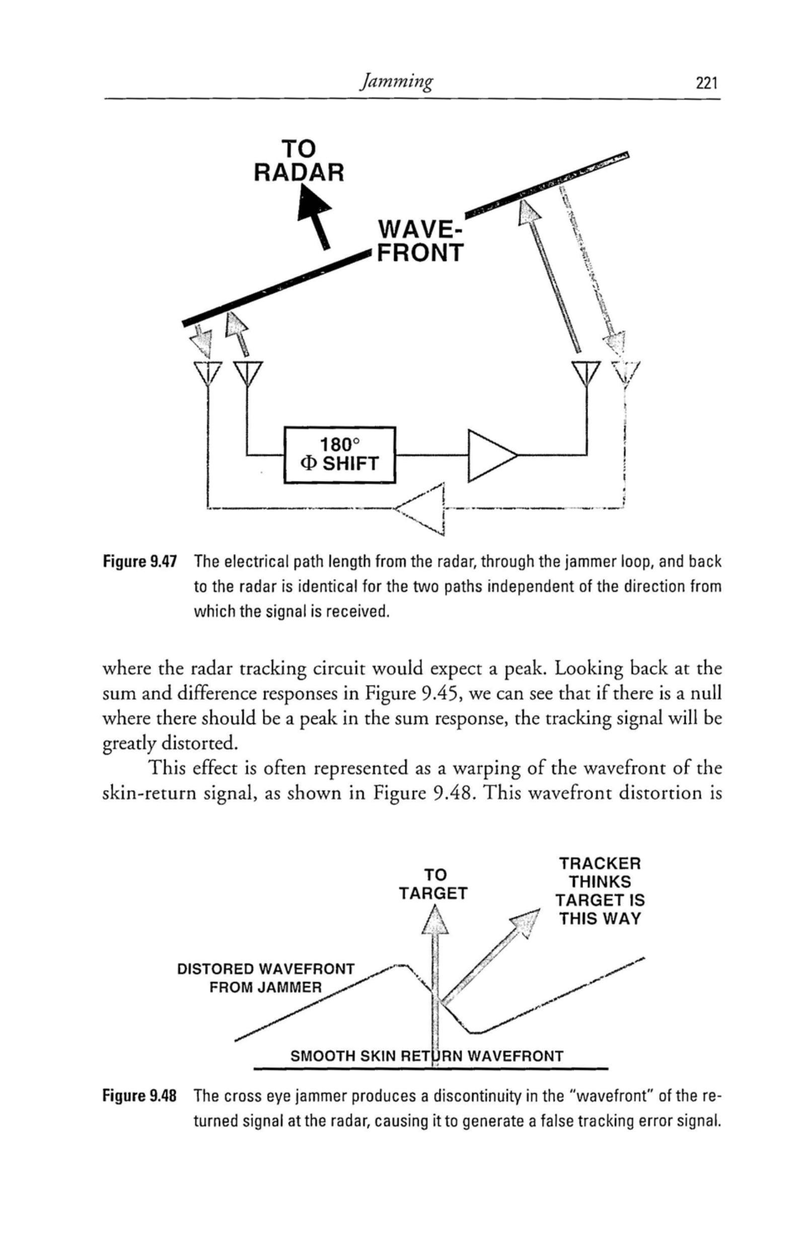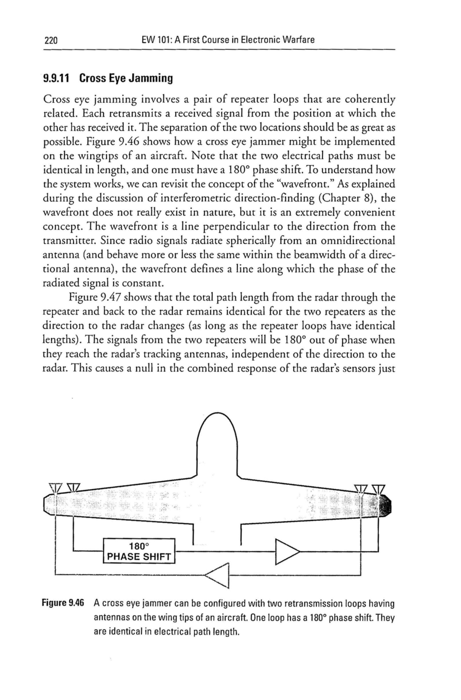 交叉眼干扰使用一对相干关联的转发环路。每个环路转发由另一环路接收到的信号,两环路的物理分离应尽可能大。图9.46展示了在飞机翼尖实施交叉眼干扰的方式。需注意,两条电气路径必须长度完全相同,其中一条需加入\(180^{\circ}\)相移。为理解其工作机制,可以重新回顾“波前”的概念。如第8章干涉测向讨论中所述,波前并不存在于自然界中,但却是一个极其方便的概念。波前是垂直于传播方向的平面,沿其信号相位保持恒定。