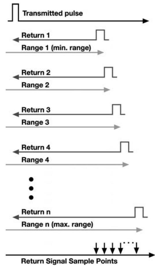 图 3.33:沿天线波束的主轴方向,雷达按脉冲宽度间隔采样返回信号,形成距离单元。