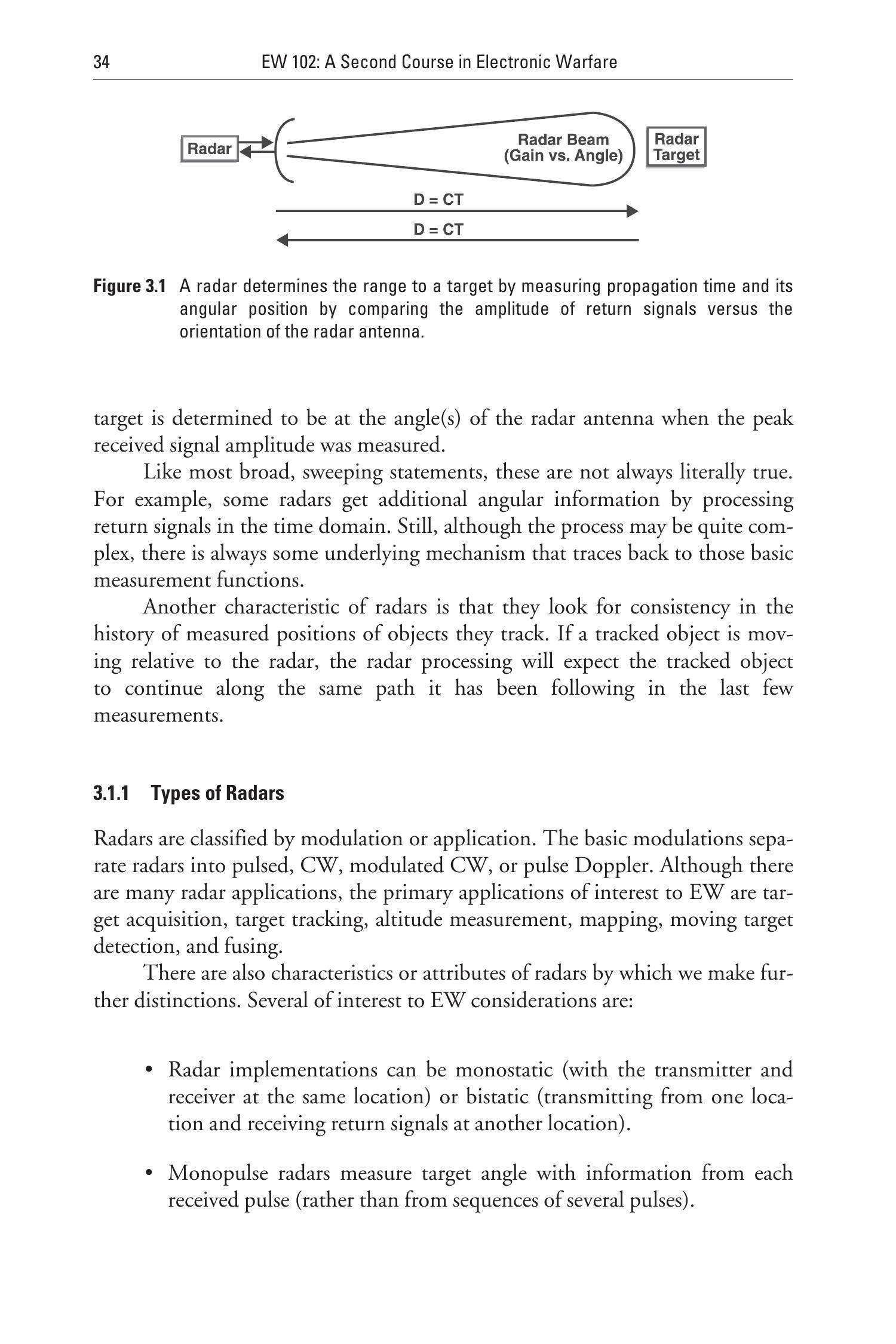 雷达可以按调制方式或应用类型分类。基本调制方式将雷达分为脉冲雷达、连续波(CW)雷达、调制CW雷达和脉冲多普勒雷达。尽管雷达应用种类繁多,但对电子战而言,主要感兴趣的应用包括目标搜索、目标跟踪、高度测量、成像、动目标探测和引信。