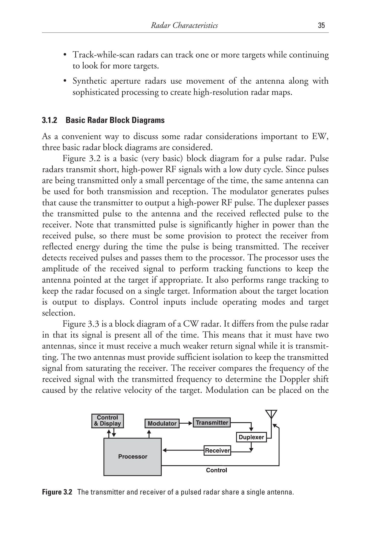 图3.2是一个基本的(非常基本的)脉冲雷达框图。脉冲雷达以低占空比发射短时高功率射频脉冲。由于脉冲发射仅占总时间的一小部分,因此发射与接收可以共用同一天线。调制器产生脉冲,驱动发射机发射高功率射频脉冲。双工器将发射脉冲传送到天线,并将反射脉冲传送到接收机。需要注意的是,发射脉冲功率远大于接收脉冲功率,因此必须采取措施在发射期间保护接收机不受反射能量损坏。接收机检测接收到的脉冲并将其传递给处理器。处理器利用接收信号幅度执行跟踪功能(在适当情况下保持天线指向目标)。它还执行距离跟踪,使雷达保持对单一目标的关注。目标位置信息输出到显示器。控制输入包括操作模式和目标选择。